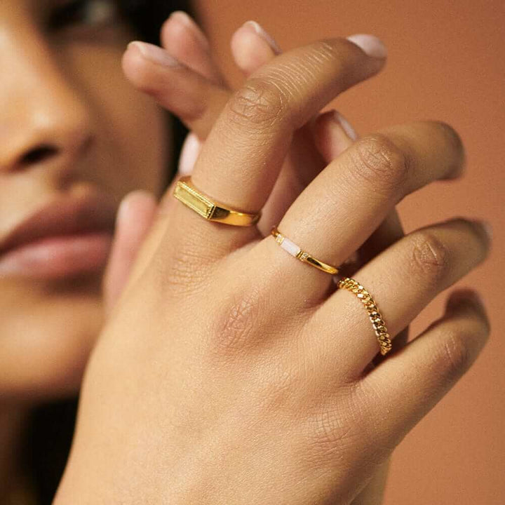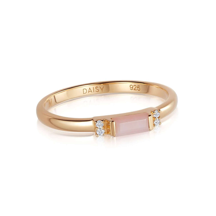 Daisy London is a British jewelry brand renowned for its modern and minimalist designs. Founded in 2009 by Ruth Bewsey, Daisy has gained popularity for its symbolic pieces that blend simplicity with meaningfulness. Favoring timelessness over trends, the brand's high-quality jewelry is designed to be worn daily and cherished for years to come. Ruth aspires to create jewelry that will make you feel unapologetically yourself. Every piece reflects effortless style with a touch of personal significance.Style notes: Add a touch of luxury to your everyday style. Set with Pink Opal and White Topaz, this jewellery box must-have gives that hint of colour you've been looking for. Style solo for a less is more moment or layer with other stacking bands for a curated look you'll be wearing on repeat.Price: Please note price may vary due to exchange rate differences or shipping, duties and taxes. Price may also vary with materials choice. Final price is calculated at checkout at the designer's website. Materials: 18k gold plated silver with pink opal. Dimensions: Gemstone measures: 9.1 x 2.2 x 2.9mm. Band thickness: 0.8mm.