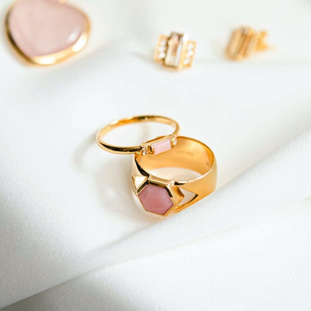 18k gold plated silver with pink opal. Dimensions: Gemstone measures: 9.1 x 2.2 x 2.9mm. Band thickness: 0.8mm.