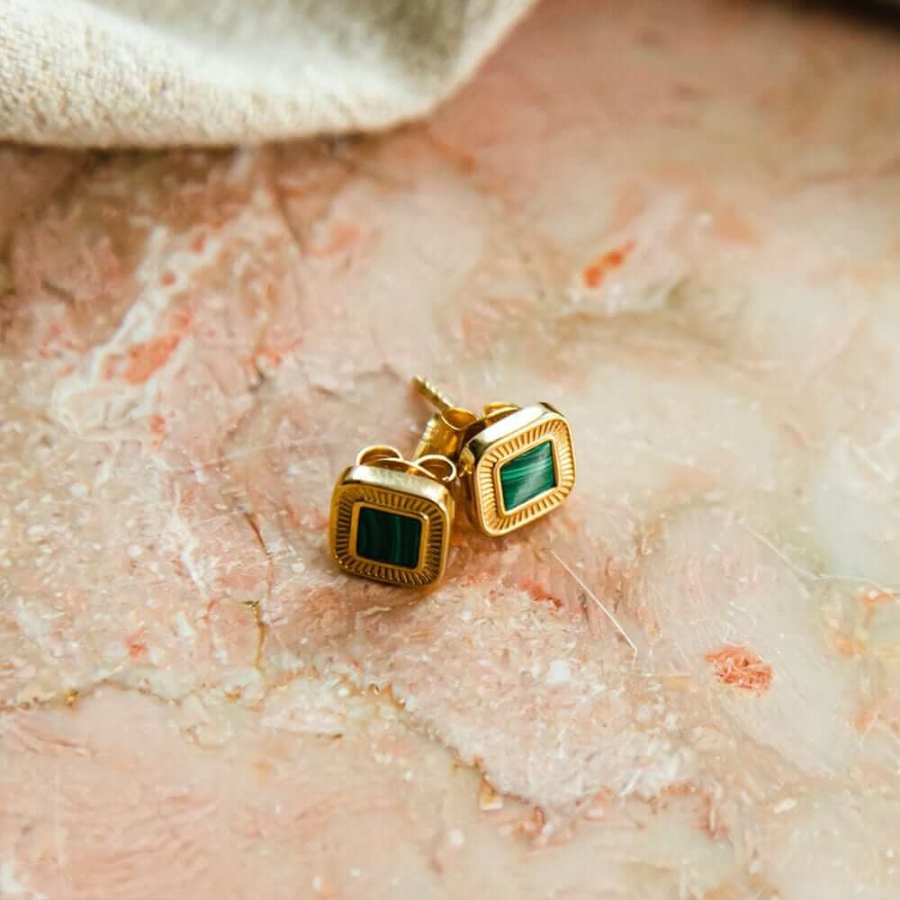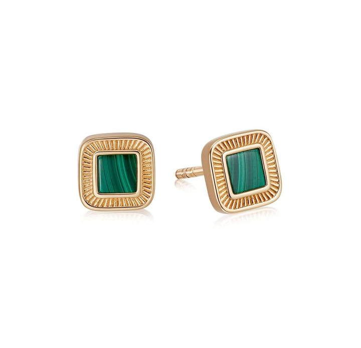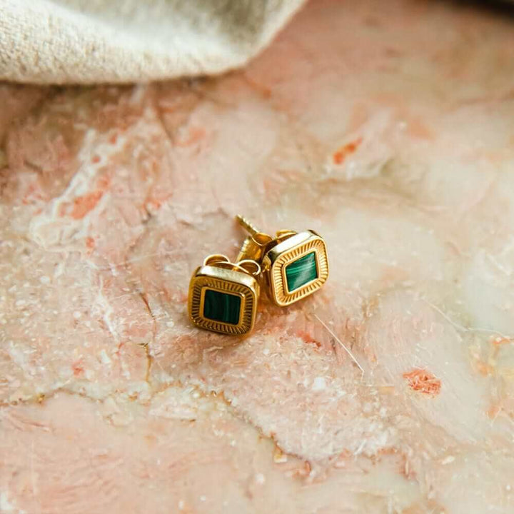 18k gold plated silver with malachite. Dimensions: Stud measures: 7.3 x 7.3mm