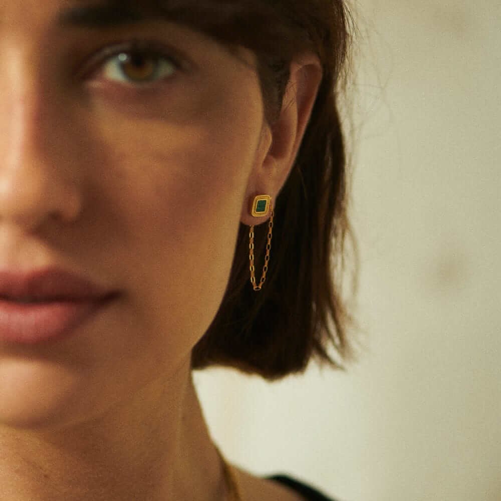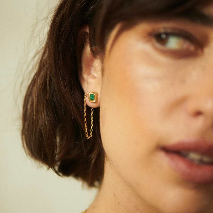 Daisy London is a British jewelry brand renowned for its modern and minimalist designs. Founded in 2009 by Ruth Bewsey, Daisy has gained popularity for its symbolic pieces that blend simplicity with meaningfulness. Favoring timelessness over trends, the brand's high-quality jewelry is designed to be worn daily and cherished for years to come. Ruth aspires to create jewelry that will make you feel unapologetically yourself. Every piece reflects effortless style with a touch of personal significance.Style notes: These statement art deco-inspired studs ooze effortless luxury. Featuring a malachite centre with an engraved sterling silver edge, these earrings are bound to be a staple in any jewellery lover's collection.Price: Please note price may vary due to exchange rate differences or shipping, duties and taxes. Price may also vary with materials choice. Final price is calculated at checkout at the designer's website. Materials: 18k gold plated silver with malachite. Dimensions: Stud measures: 7.3 x 7.3mm