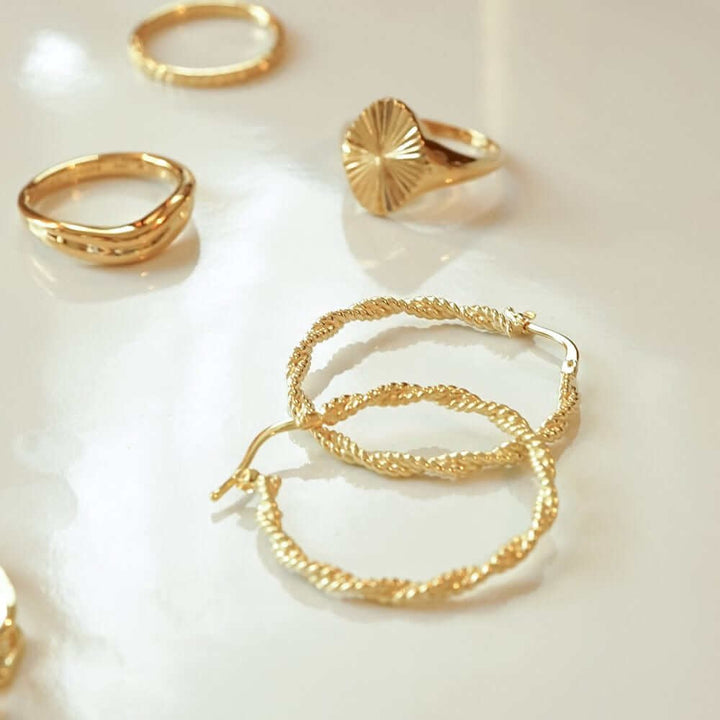 Daisy London is a British jewelry brand renowned for its modern and minimalist designs. Founded in 2009 by Ruth Bewsey, Daisy has gained popularity for its symbolic pieces that blend simplicity with meaningfulness. Favoring timelessness over trends, the brand's high-quality jewelry is designed to be worn daily and cherished for years to come. Ruth aspires to create jewelry that will make you feel unapologetically yourself. Every piece reflects effortless style with a touch of personal significance.Style notes: Delicate and elegant, these hoops feature a braided design. With a slim silhouette and in our signature 18ct gold plating, they're the ultimate addition to any hoop lover's collection.Price: Please note price may vary due to exchange rate differences or shipping, duties and taxes. Price may also vary with materials choice. Final price is calculated at checkout at the designer's website. Materials: 18k gold plated silver. Dimensions: Internal diameter measures: 30mm