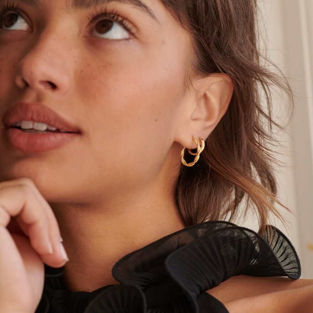 Daisy London is a British jewelry brand renowned for its modern and minimalist designs. Founded in 2009 by Ruth Bewsey, Daisy has gained popularity for its symbolic pieces that blend simplicity with meaningfulness. Favoring timelessness over trends, the brand's high-quality jewelry is designed to be worn daily and cherished for years to come. Ruth aspires to create jewelry that will make you feel unapologetically yourself. Every piece reflects effortless style with a touch of personal significance.Style notes: These mid-sized hoops feature a braided design with a practical hinge closure. With their elegant look and textured structure, they're the perfect earring to add some edge to your stack.Price: Please note price may vary due to exchange rate differences or shipping, duties and taxes. Price may also vary with materials choice. Final price is calculated at checkout at the designer's website. Materials: 18k gold plated silver. Dimensions: Internal Diameter Measures: 20mm.