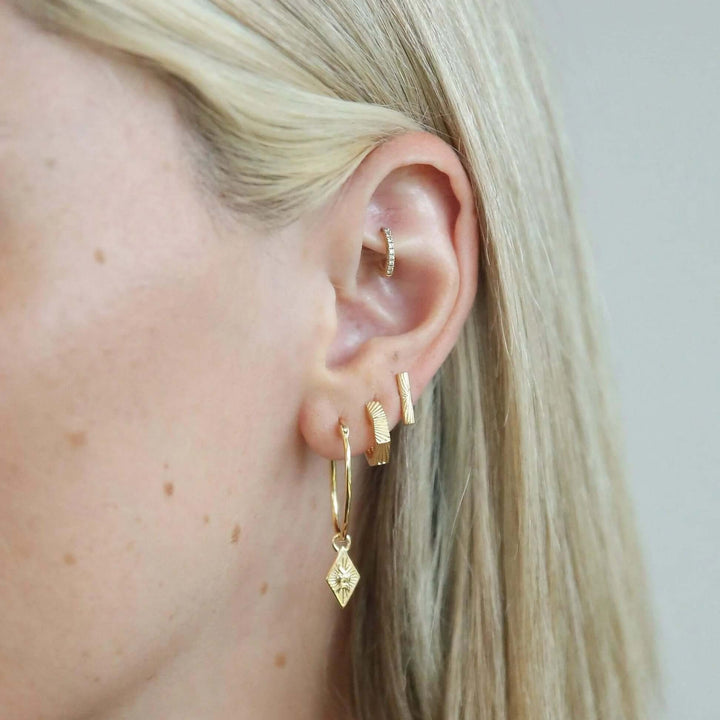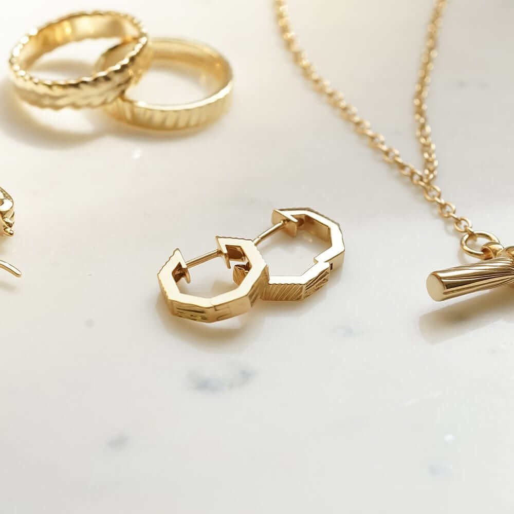 Daisy London is a British jewelry brand renowned for its modern and minimalist designs. Founded in 2009 by Ruth Bewsey, Daisy has gained popularity for its symbolic pieces that blend simplicity with meaningfulness. Favoring timelessness over trends, the brand's high-quality jewelry is designed to be worn daily and cherished for years to come. Ruth aspires to create jewelry that will make you feel unapologetically yourself. Every piece reflects effortless style with a touch of personal significance.Style notes: Edgy all day, everyday accessorising. Daisy's Estée Lalonde Octagonal Huggie Hoops have faceted edges with subtle engraving. Sitting close to the ear, these cute hoop earrings can be worn on any ear piercing. Timeless, simple and stylish, they are inspired by Estée's love of vintage jewellery.Price: Please note price may vary due to exchange rate differences or shipping, duties and taxes. Price may also vary with materials choice. Final price is calculated at checkout at the designer's website. Materials: 18k gold plated silver. Dimensions: Hoop external diameter: 13mm. Hoop internal diameter: 9mm.