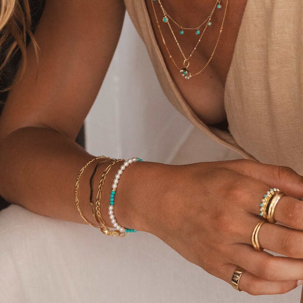 Daisy London is a British jewelry brand renowned for its modern and minimalist designs. Founded in 2009 by Ruth Bewsey, Daisy has gained popularity for its symbolic pieces that blend simplicity with meaningfulness. Favoring timelessness over trends, the brand's high-quality jewelry is designed to be worn daily and cherished for years to come. Ruth aspires to create jewelry that will make you feel unapologetically yourself. Every piece reflects effortless style with a touch of personal significance.Style notes: Add summer inspired colours to your every day style with textured turquoise beads and iridescent pearls. Featuring recycled silver with 18ct spacers, this timeless bracelet is just the thing to elevate any look.Price: Please note price may vary due to exchange rate differences or shipping, duties and taxes. Price may also vary with materials choice. Final price is calculated at checkout at the designer's website. Materials: 18k gold plated silver with acrylic pearls and turquoise. Dimensions: Chain length: 6' (extendable by 1')
