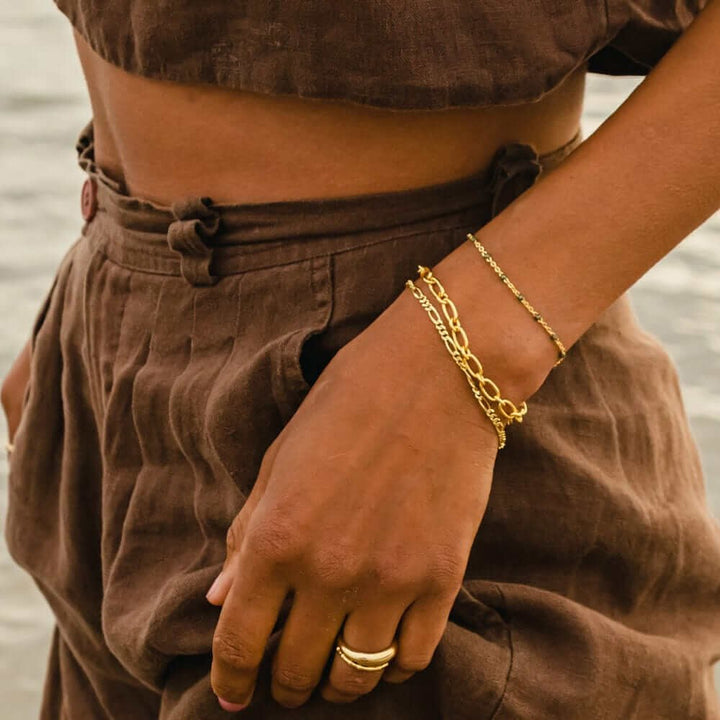 Daisy London is a British jewelry brand renowned for its modern and minimalist designs. Founded in 2009 by Ruth Bewsey, Daisy has gained popularity for its symbolic pieces that blend simplicity with meaningfulness. Favoring timelessness over trends, the brand's high-quality jewelry is designed to be worn daily and cherished for years to come. Ruth aspires to create jewelry that will make you feel unapologetically yourself. Every piece reflects effortless style with a touch of personal significance.Style notes: Whether it's paired with chains and charms or worn alone, meet the bracelet that won't leave your wrist. Crafted in 100% sterling silver and 18ct gold plate this everyday staple, is all about effortless styling. See you at checkout?Price: Please note price may vary due to exchange rate differences or shipping, duties and taxes. Price may also vary with materials choice. Final price is calculated at checkout at the designer's website. Materials: 18k gold plated brass. Dimensions: Chain length: 180mm.