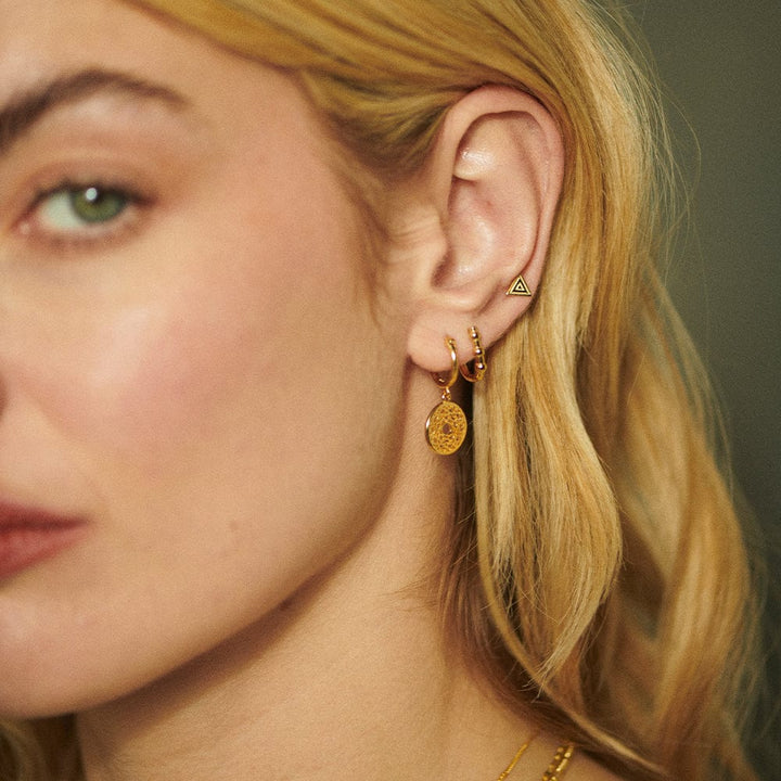 INTELLIGENCE AWARENESS THOUGHTFULNESS Choose the Chakra symbol that best represents your inner self. The Crown Chakra is emotionally connected with aspirations, spirituality and integration of ones' conscious and subconscious. Made from 18ct gold plated silver, featuring an intricate charm on a fine hoop.