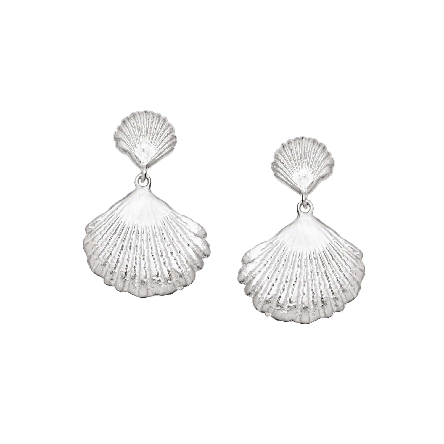 The Double Shell Earrings are the ultimate statement piece for your jewellery box, sculpted from recycled sterling silver, featuring two perfectly scalloped clam shells that dangle from the ear with a butterfly back fastening.