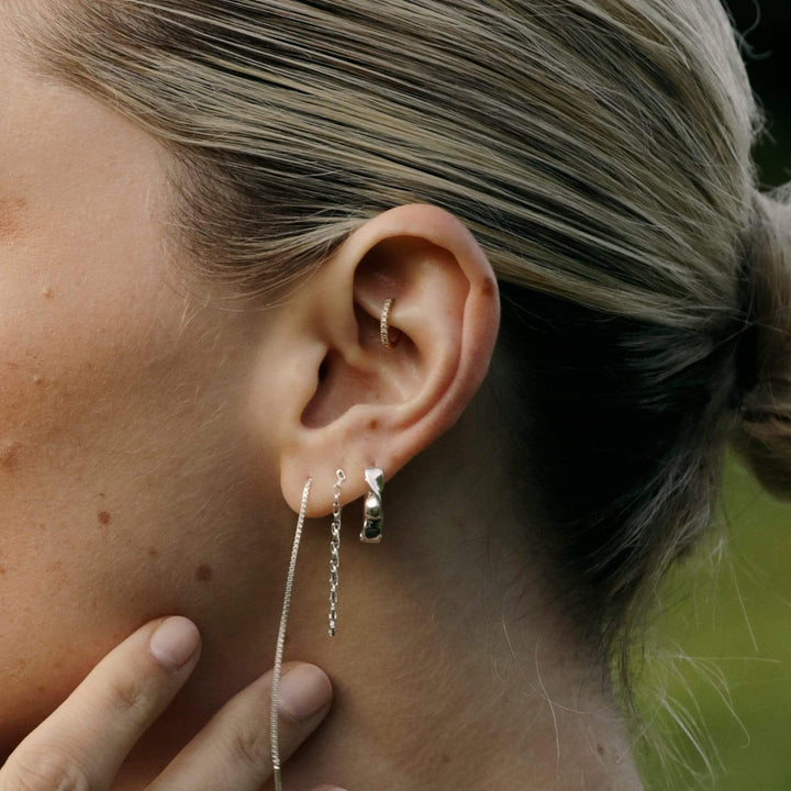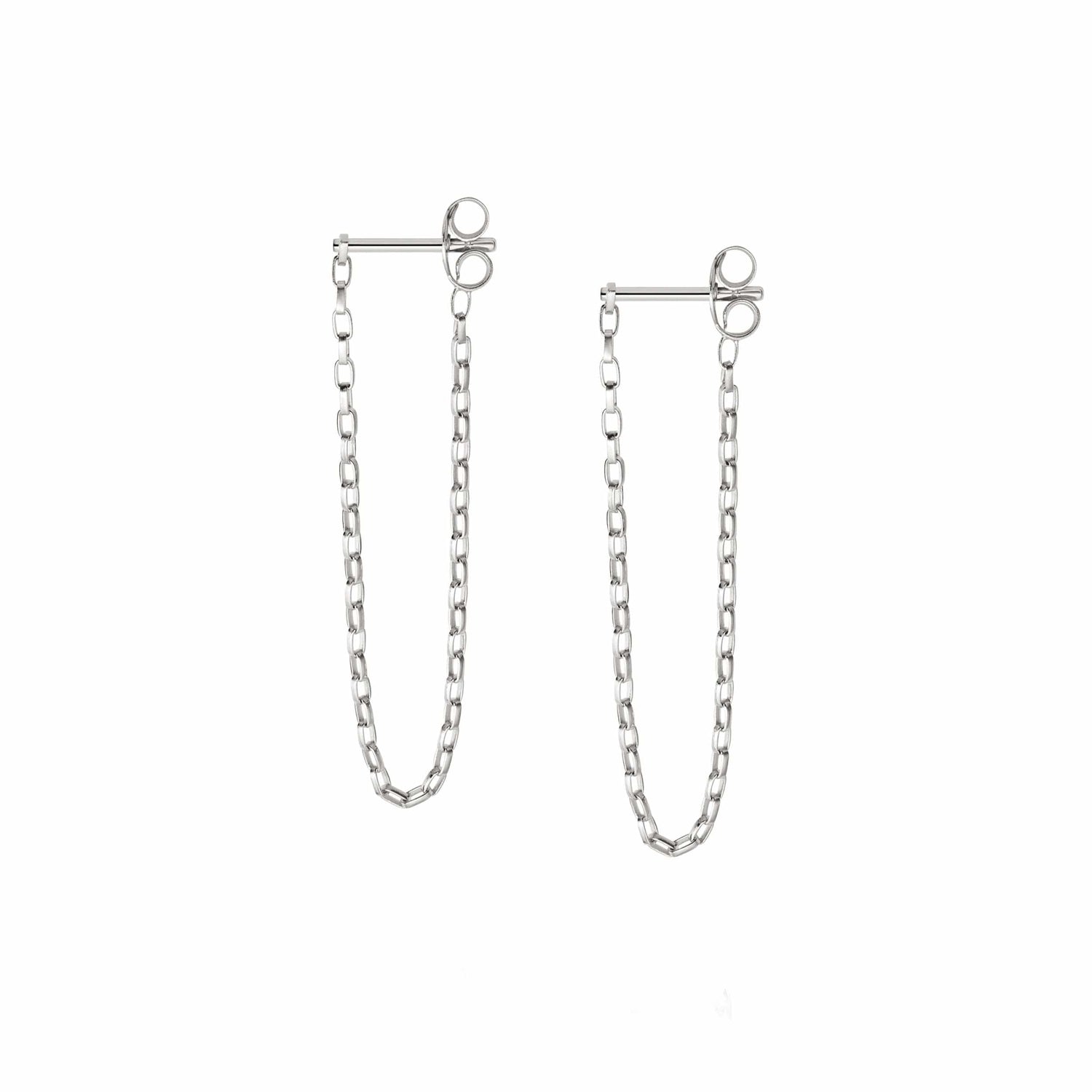 These chain earrings are all we can think about. Featuring a fine box chain that drops in an elegant parallel line with a butterfly back, the Box Chain Earrings are a must-have to add a little something extra to your everyday ear stack.