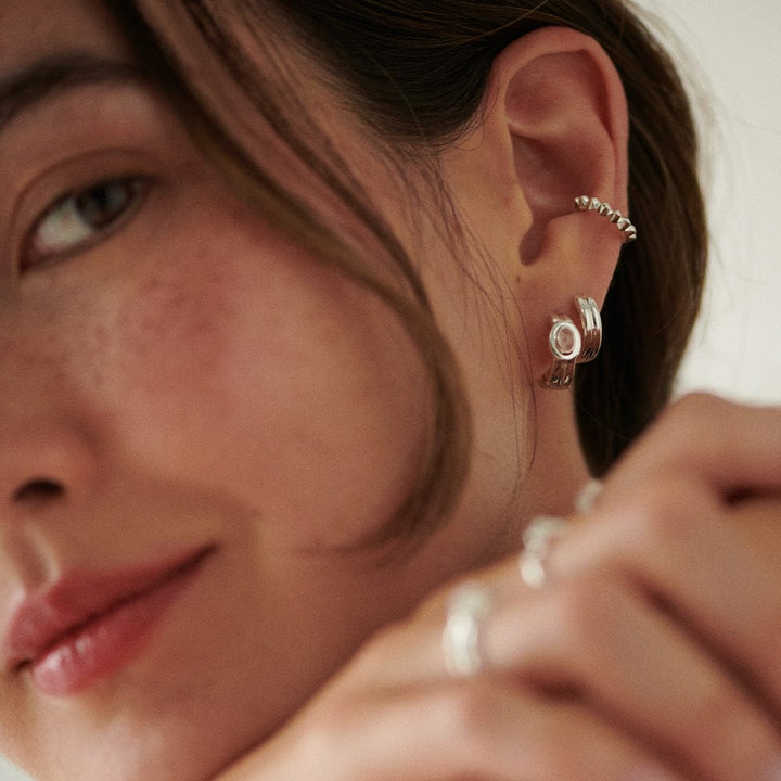 LUCK ABUNDANCE CHANGE Add a little sparkle to your stack with these moonstone huggies. Representing new beginnings and abundance, style solo or with the rest of the collection for that all-over galactic glow.