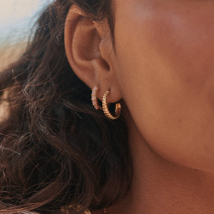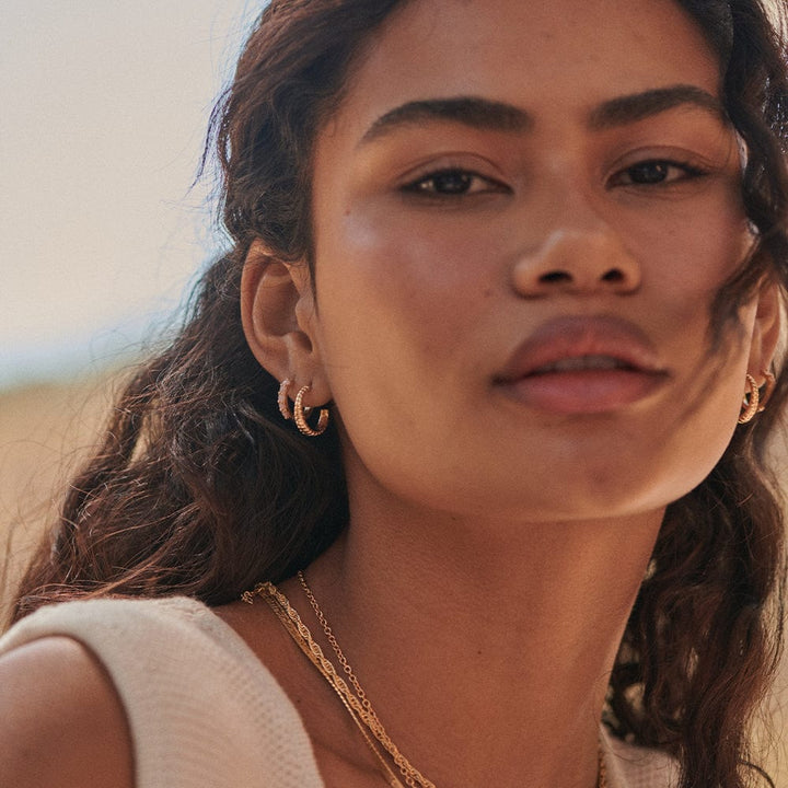 This stand out pair of hoops feature a horizontal striped texture on high-shine 18ct gold plating. With their unique look, yet minimal tone, they're the perfect transition piece from day to night.