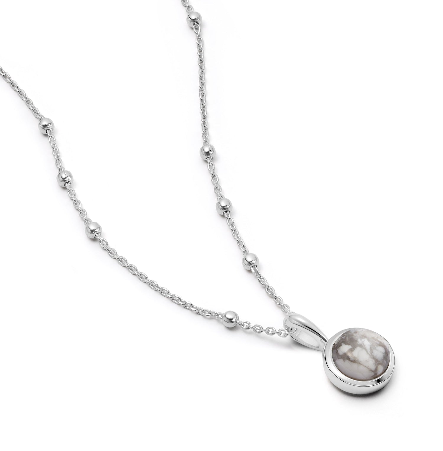 CALMNESS CONCENTRATION CREATIVITY Let your jewellery do the talking. Featuring a round Howlite stone set on an adjustable 16'-18' bobble chain, this cute pendant is thought to exude a sense of calm and absorb feelings of anger, strain or stress. Known to heighten concentration and sharpen the memory.