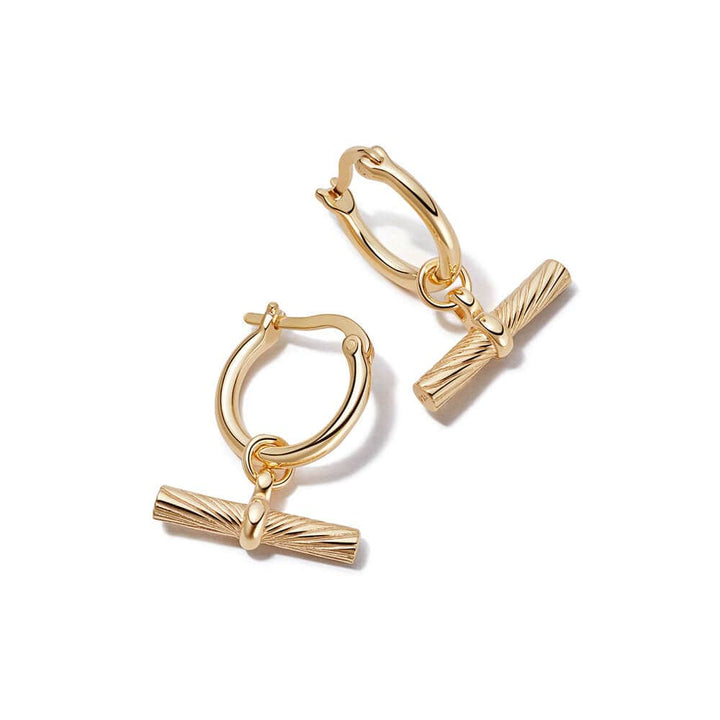 A classic shape made modern, our Estée Lalonde T Bar Charm Earrings will become the new staple of your earring collection. A subtly engraved T Bar charm hung from a small drop hoop, perfect for any ear piercing and works to create a beautiful stacked look.