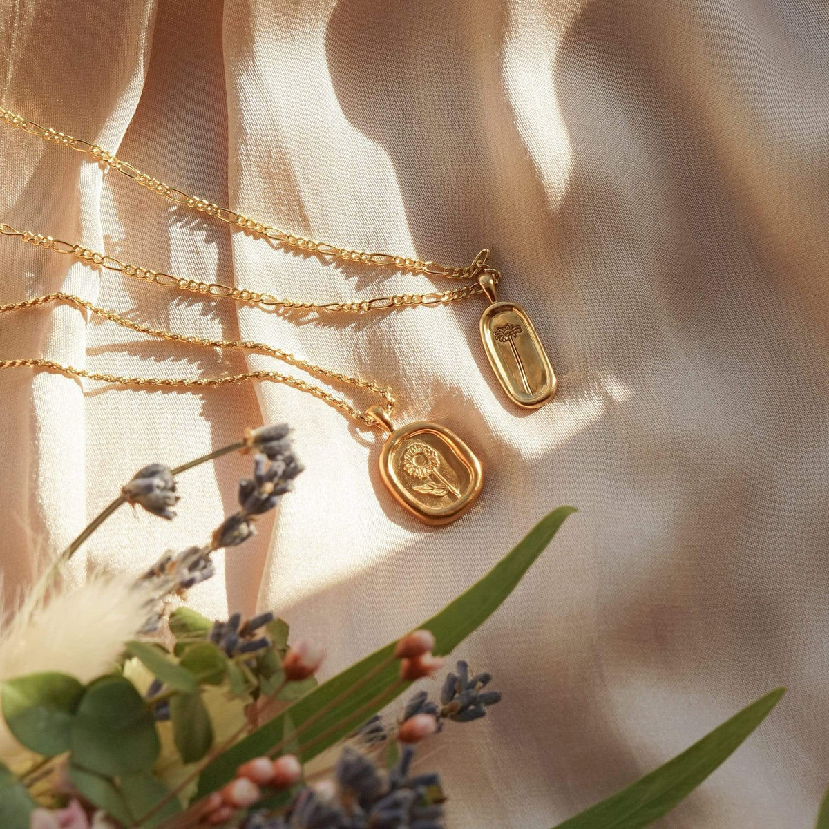 Flowers that will last forever. The Wild Daisy Necklace is made from 18ct gold plated silver with a subtle matte finish and features a pendant decorated with embossed daisy flowers. Hung from an intricate figaro chain, this pendant necklace is perfect worn solo or layered with your favourite chain necklaces.