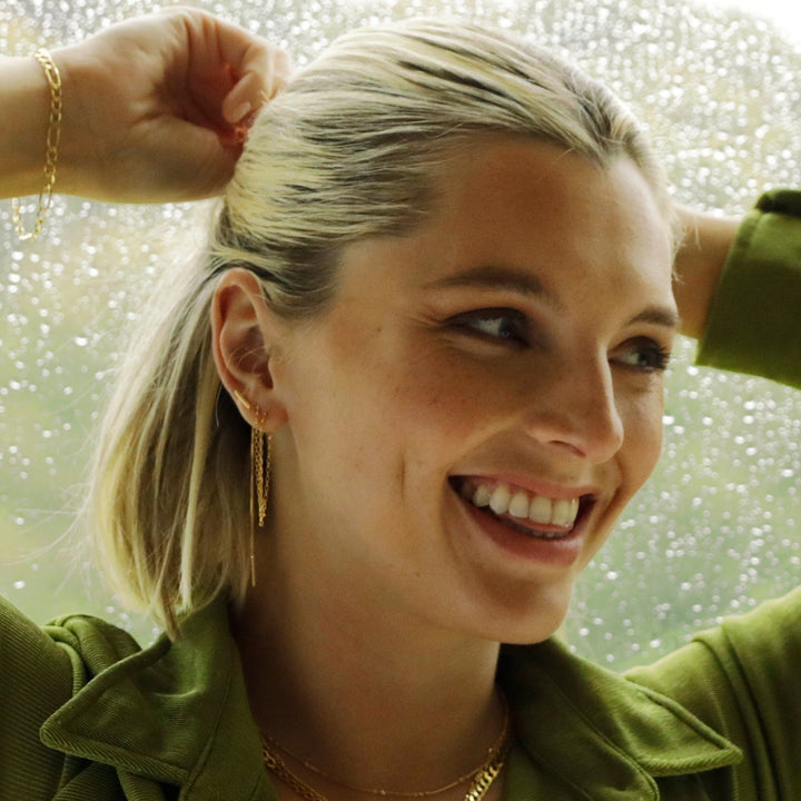 These unique fine box chain earrings are the missing link from your jewellery collection. Featuring a delicate T Bar that can be woven through your piercings or worn as a stud or a drop, the perfect mix of effortless style and contemporary edge.
