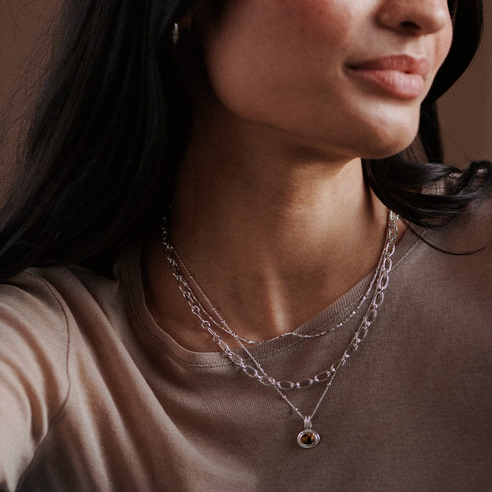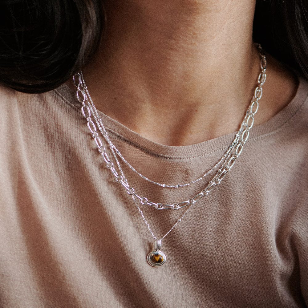 CALMNESS BALANCE GOOD FORTUNE This vibrant amazonite pendant is set on an elegant three-ball chain. With the stone's calming properties, this 100% recycled sterling silver necklace is the ultimate addition to your stack.