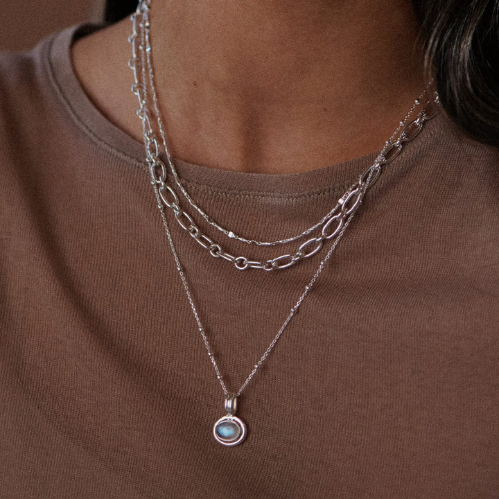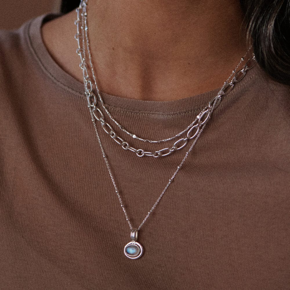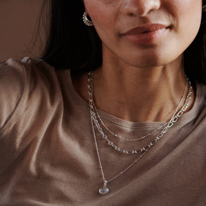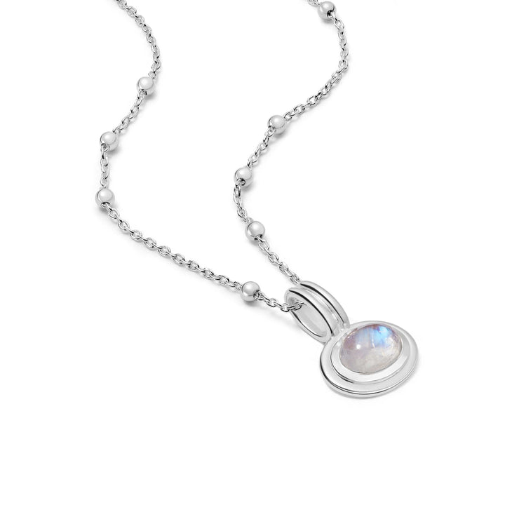 LUCK ABUNDANCE CHANGE Set on a 100% recycled sterling silver chain, this moonstone pendant makes the perfect addition to your jewellery box. Its iridescent white stone represents new beginnings and abundance, thought to bring good fortune to the wearer.