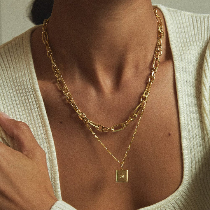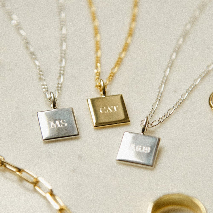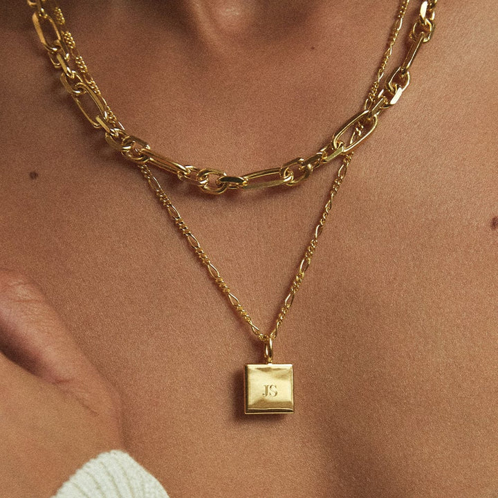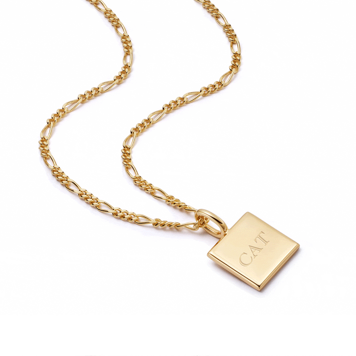 Make it personal with this engravable 18ct gold plate square pendant hung on a classic figaro chain. Whether it's a date, name or initials, this is the perfect piece to make everyday meaningful.