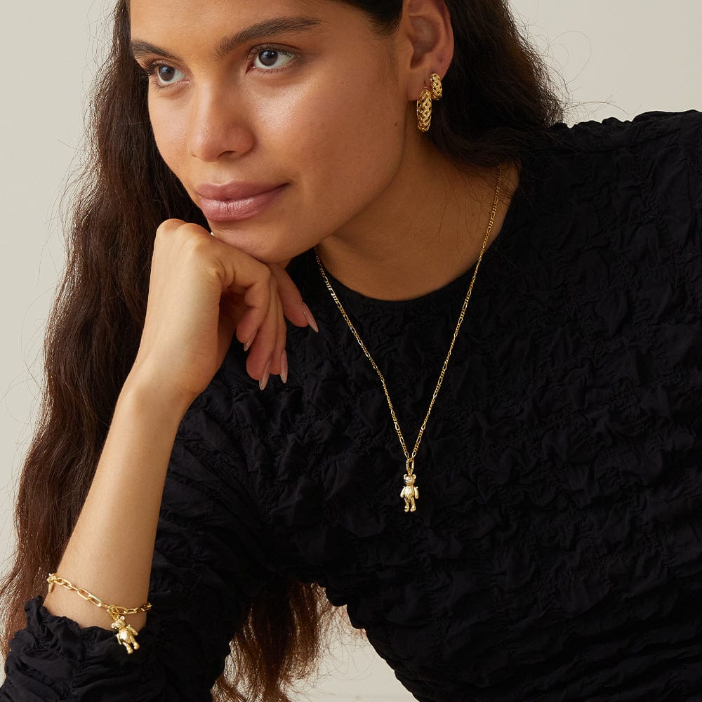 The necklace you didn't know you needed. Meet the Teddy Bear Necklace, featuring an 18ct gold plate teddy charm (with movable limbs and pearls for eyes) hung on fine chain. Styled solo or layered with chains and pearls, we're obsessed.