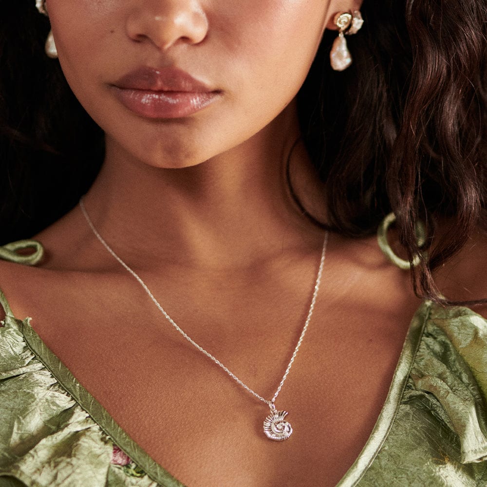 Wear a little piece of the ocean around your neck. This delicate shell pendant features pearl details hung on a fine singapore chain. Made from 100% recycled sterling silver, wear solo or layer with multiple gold chains for an everyday look.
