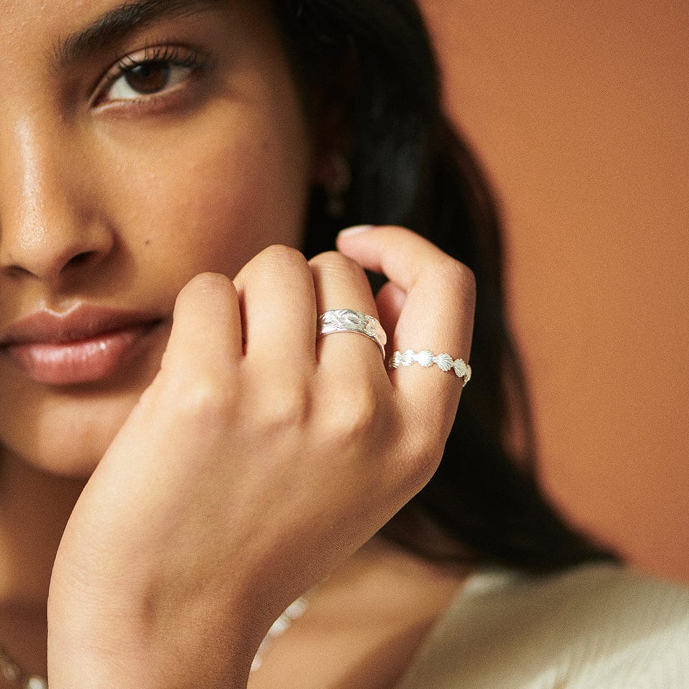 Are you ready for compliments? The Fossil Band ring is a head turner and will be the new favourite in your ring collection. Made from 18ct gold plated silver, this chunky stacking ring features carved symbols of shells, starfish and stones throughout in a matt finish.