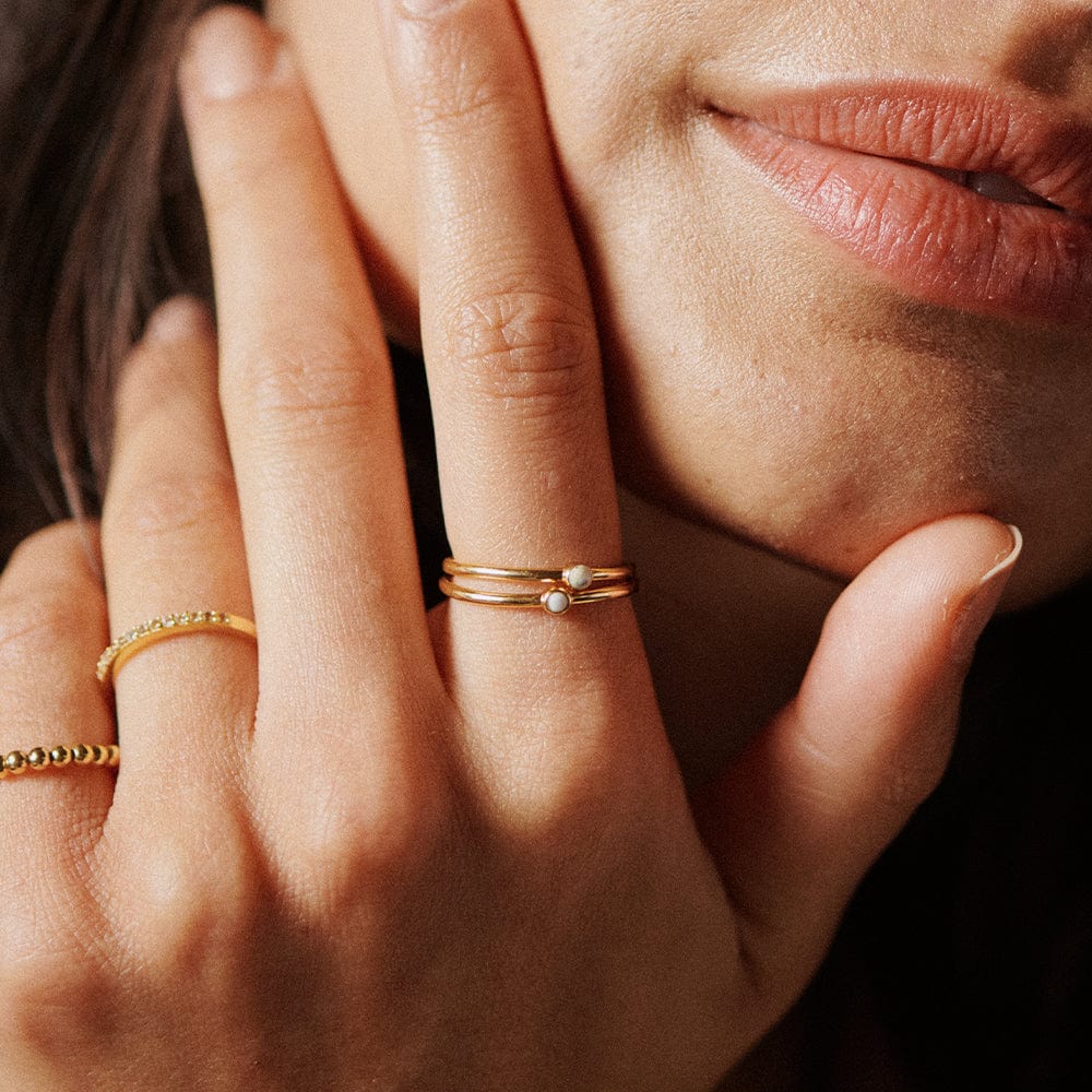 CALMNESS CONCENTRATION CREATIVITY Let your jewellery do the talking. Featuring a round Howlite stone set on a simple yet chic stacking band, it is thought to exude a sense of calm and absorb feelings of anger, strain or stress as well as known to heighten concentration and sharpen the memory.