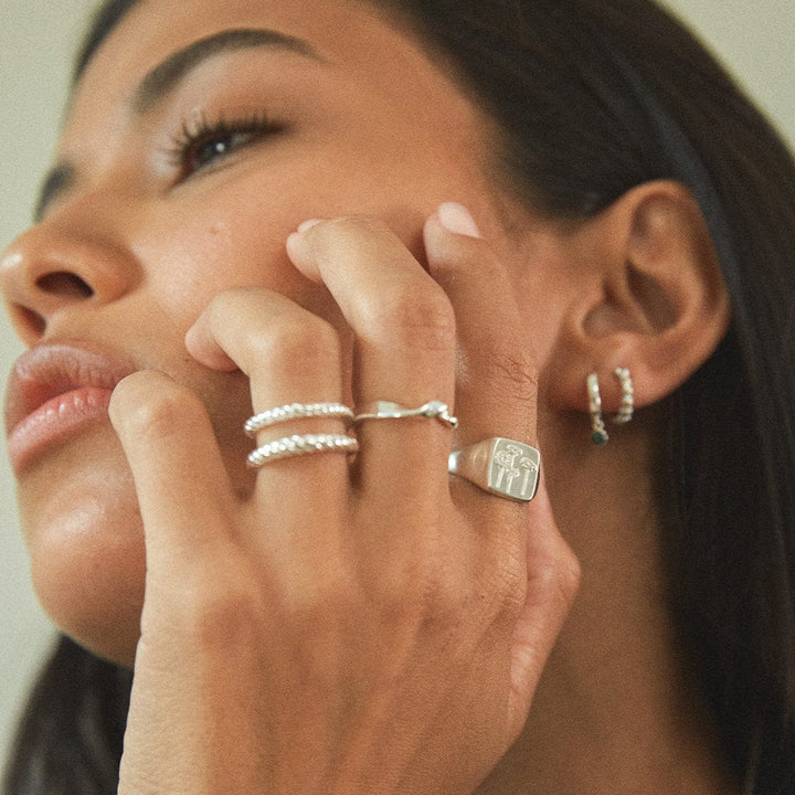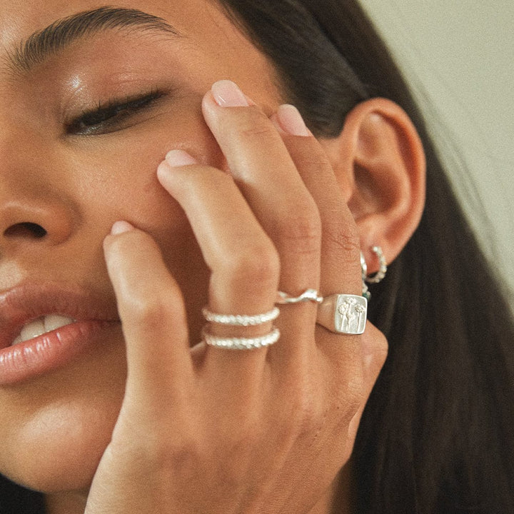 Taking inspiration from pressed flowers and wax stamps, the Sunflower Signet Ring features a carved sunflower on an oval signet ring beautifully crafted in recycled sterling silver with a subtle matte finish. Stack with other rings from the collection for a full floral look.