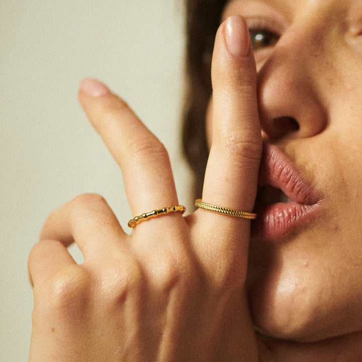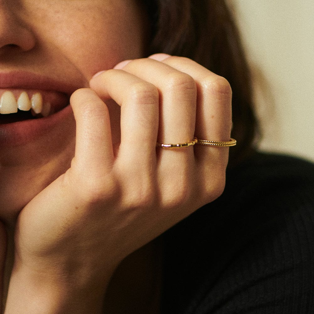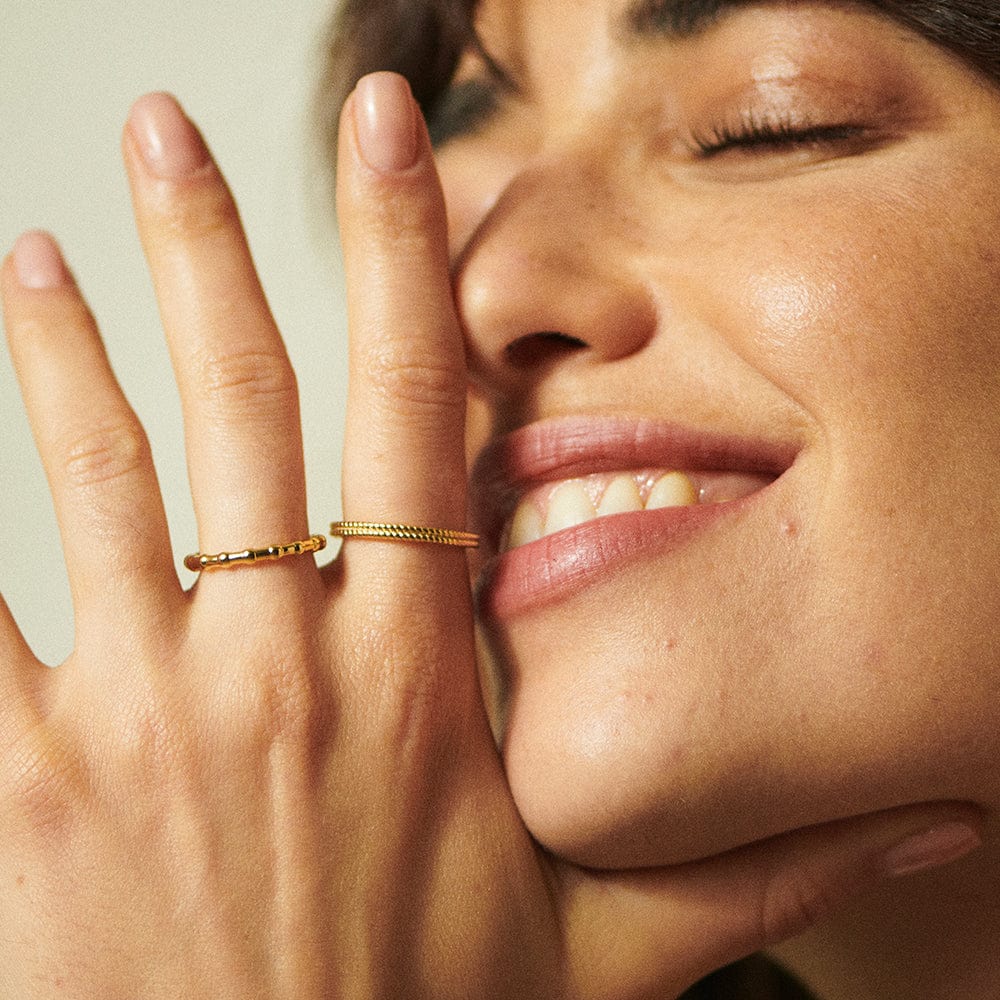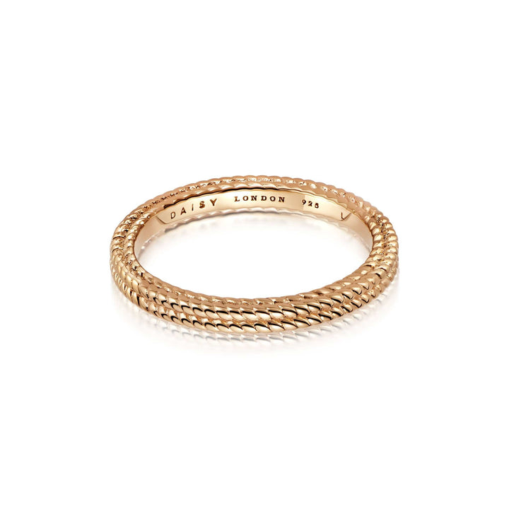 This textured stacking ring is an eye-catching addition to any stack. Hand-crafted with care in 18ct gold plate this piece adds a touch of effortless luxury to your everyday. Pile on with other bands and signet styles or go for a paired back look. You'll wonder how you ever lived without this one.