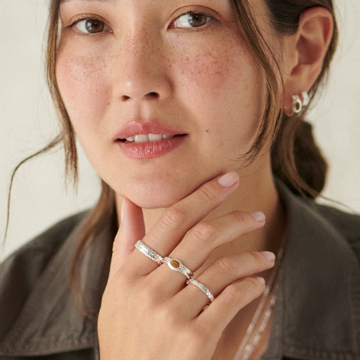 CALMNESS BALANCE GOOD FORTUNE Bring about balance with this gorgeous ring. Set on 100% recycled sterling silver, the amazonite centrepiece is thought to encourage positive thinking and good fortune.