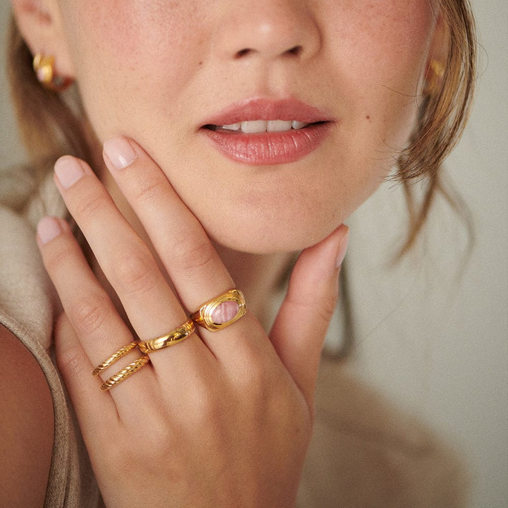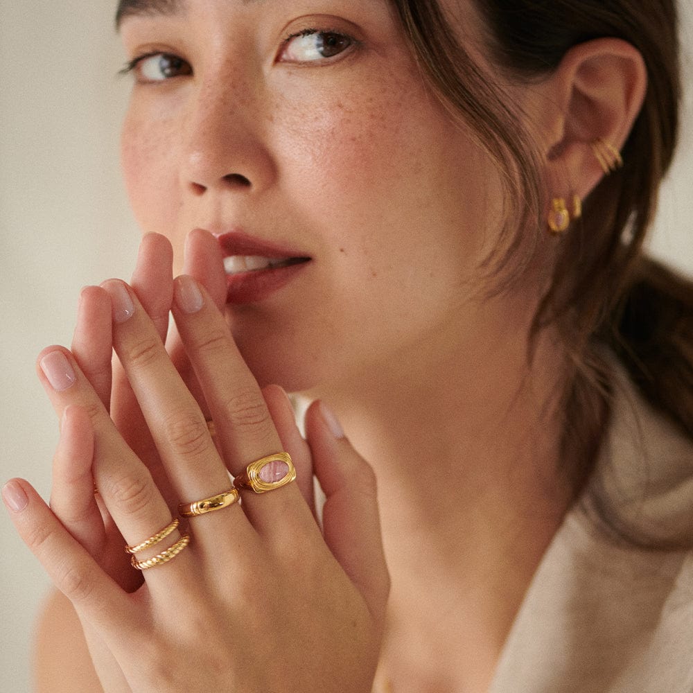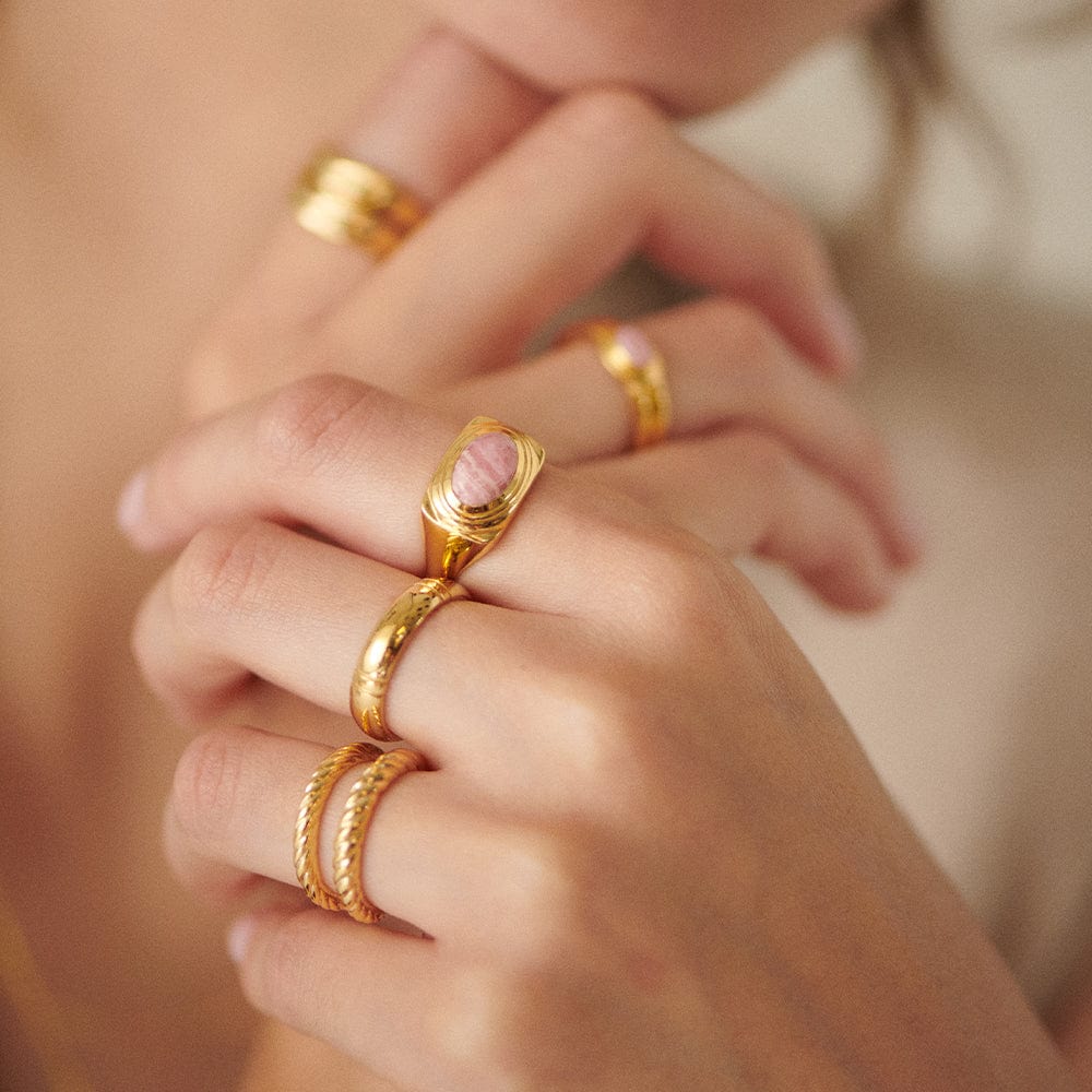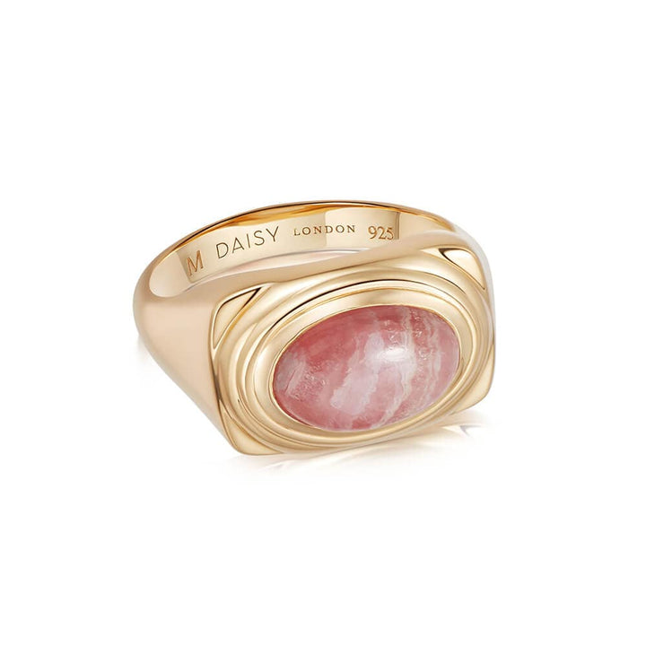 HEALING ENERGY POSITIVITY A piece you'll be wearing on repeat. This 18ct-gold plated ring features rhodochrosite, a beautiful pink stone recognised for its powerful healing properties. For help with matters of the heart and embracing positivity, add a little gemstone bling to your stack.