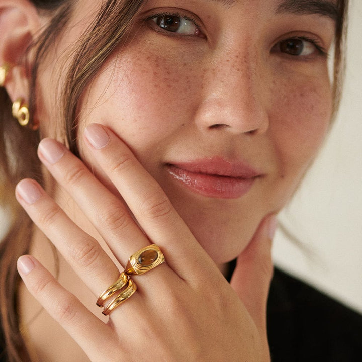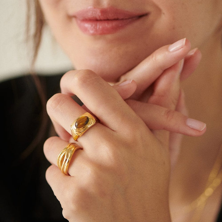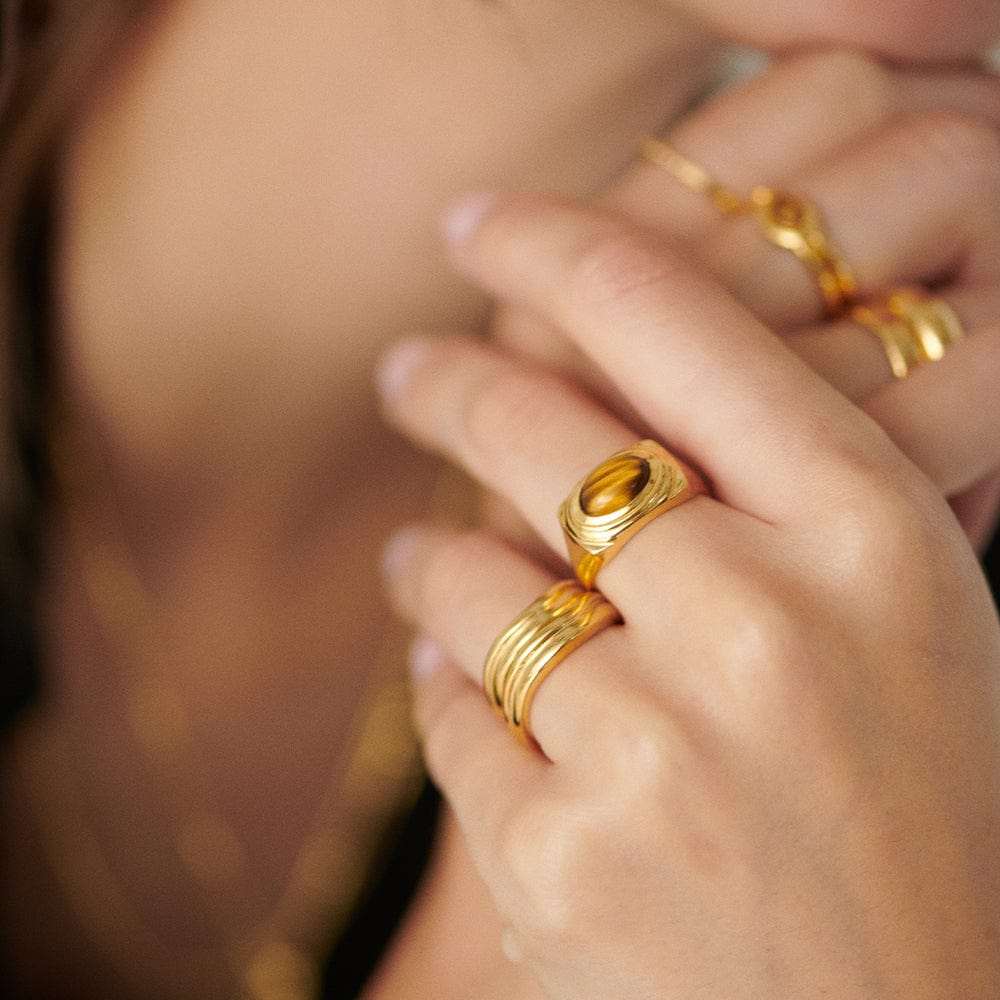 PROTECTION CLARITY FOCUS Make an elegant statement with this chunky ring. Set on 18ct gold plating, the Tiger's Eye centrepiece is known to aid with protection by dissolving negative energies.