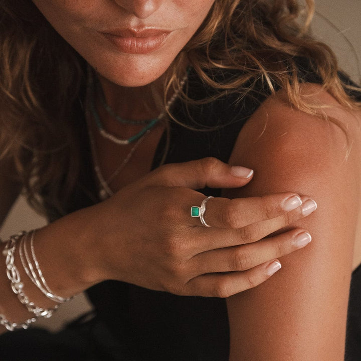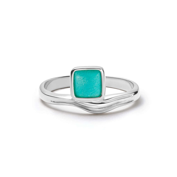 Add a little something special to your ring stack with this one. Made from 100% recycled silver, this organic wave band adds a statement with a turquoise stone. The perfect burst of colour for any outfit.