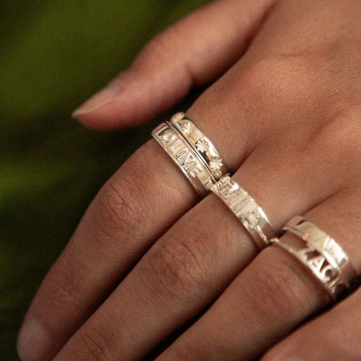 Playful, personal, stackable. This tactile spinning ring can be customised with up to two words of your choice. Your very own fidget spinner. You are welcome. Please note, this ring can fit a maximum of 12 characters in total across all words. *We cannot accept any special characters or emojis.