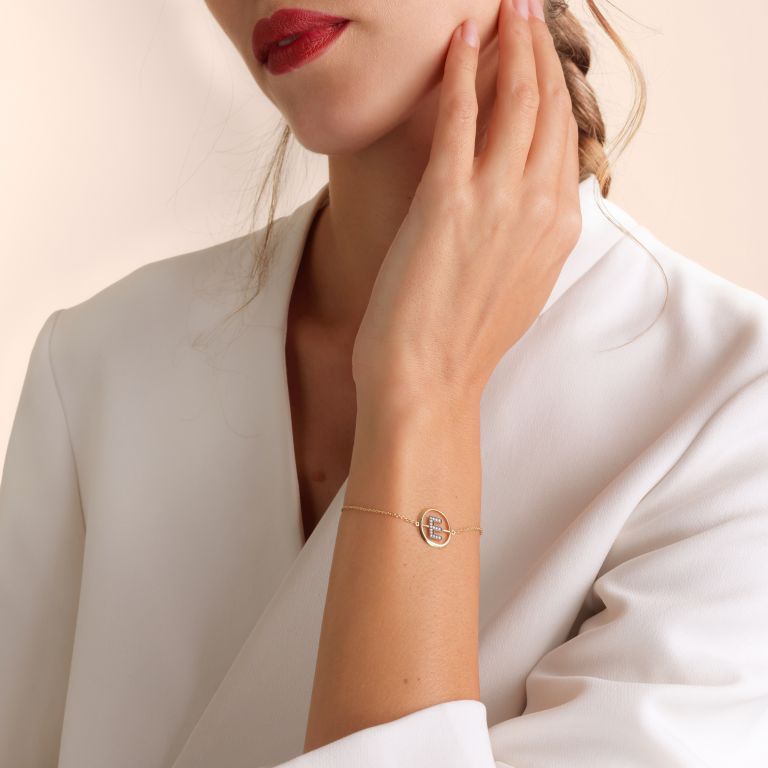 This Initials E Bracelet by Annoushka embodies elegance with a personal twist. The initial 'E' is brought to life through 16 glittering silver diamonds on a delicate gold chain. Ideal as a daily signature or thoughtful gift, it effortlessly combines sentiment and style.