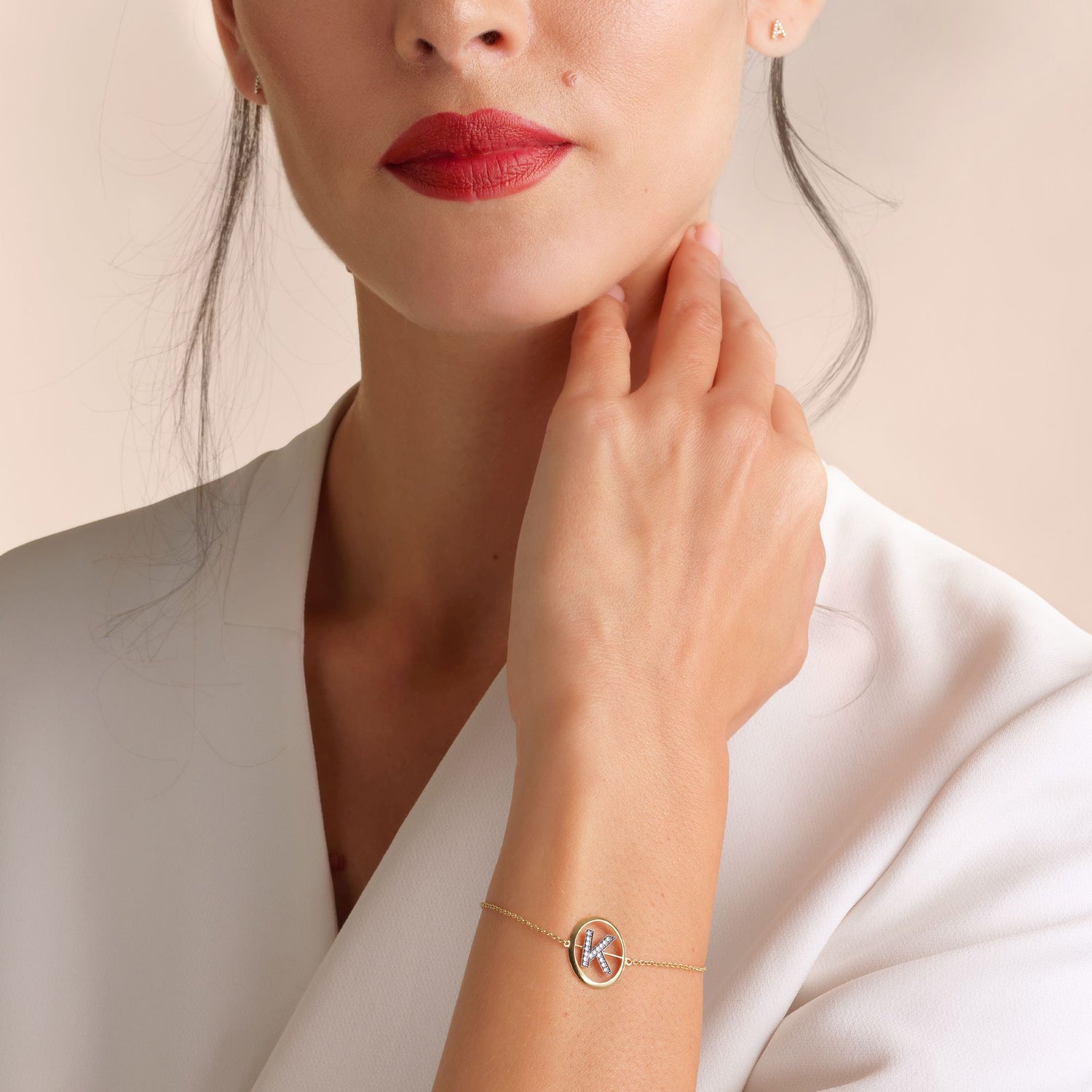 This Initials K Bracelet by Annoushka is a sleek, personalized accent that radiates quiet glamour. The initial 'K' is formed with 17 hand-set silver diamonds and mounted on a fine 18k yellow gold chain. Elegant, meaningful, and easy to wear every day.
