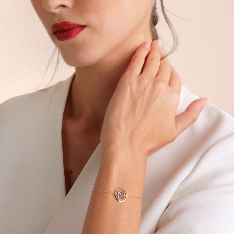 This Initials N Bracelet by Annoushka is a golden symbol of personal elegance. The letter 'N' gleams with 19 hand-set silver diamonds, casting a subtle brilliance against the 18k yellow gold chain. Finished with a bolt ring clasp and adjustable fit, it’s a classic gift for every day.
