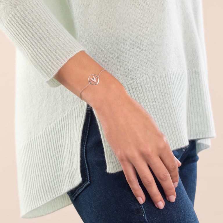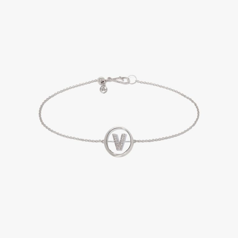 This Initials V Bracelet by Annoushka is a graceful mark of individuality. Featuring 13 silver diamonds that form the letter 'V,' this piece adds personal sparkle to your collection. The polished white gold chain ensures timeless versatility.