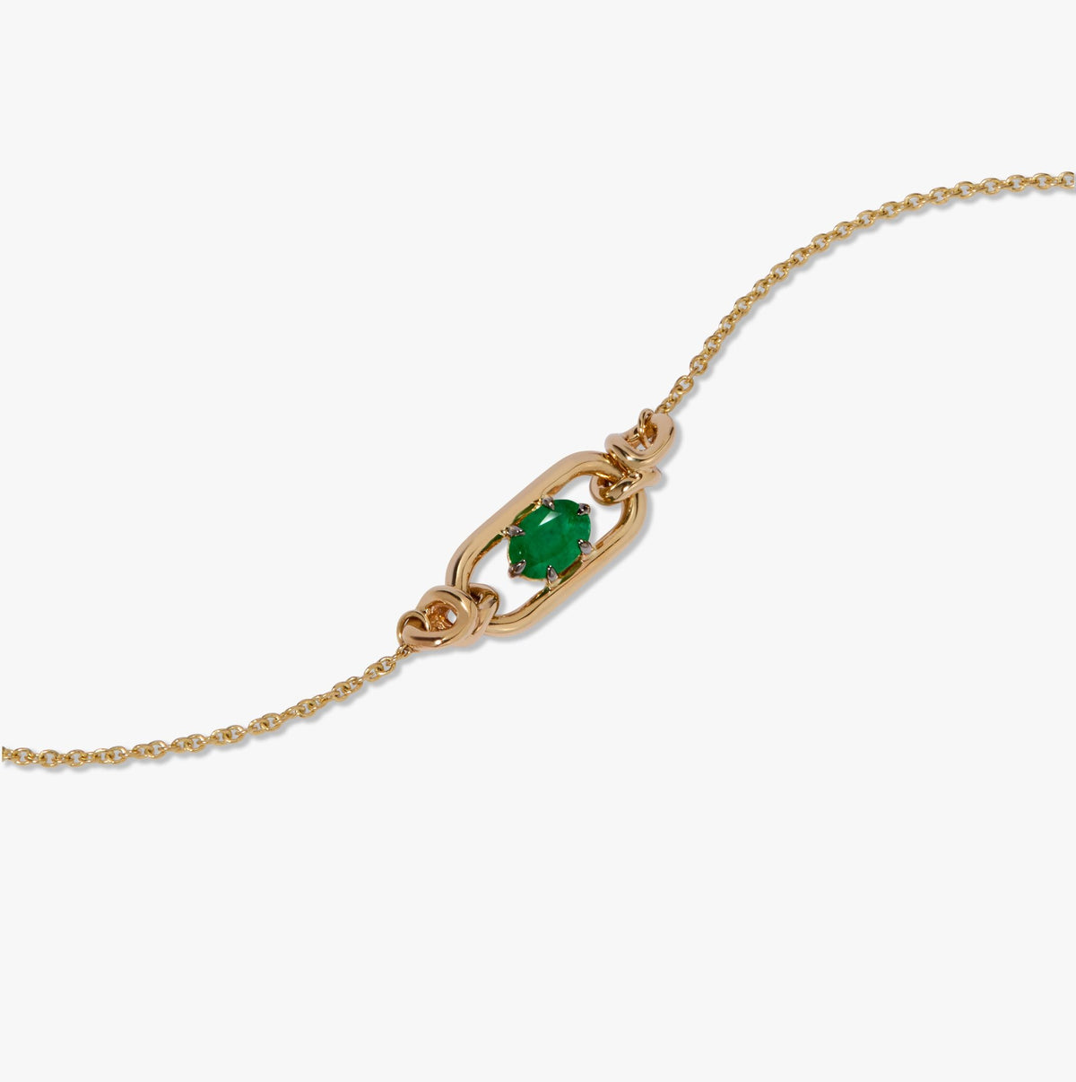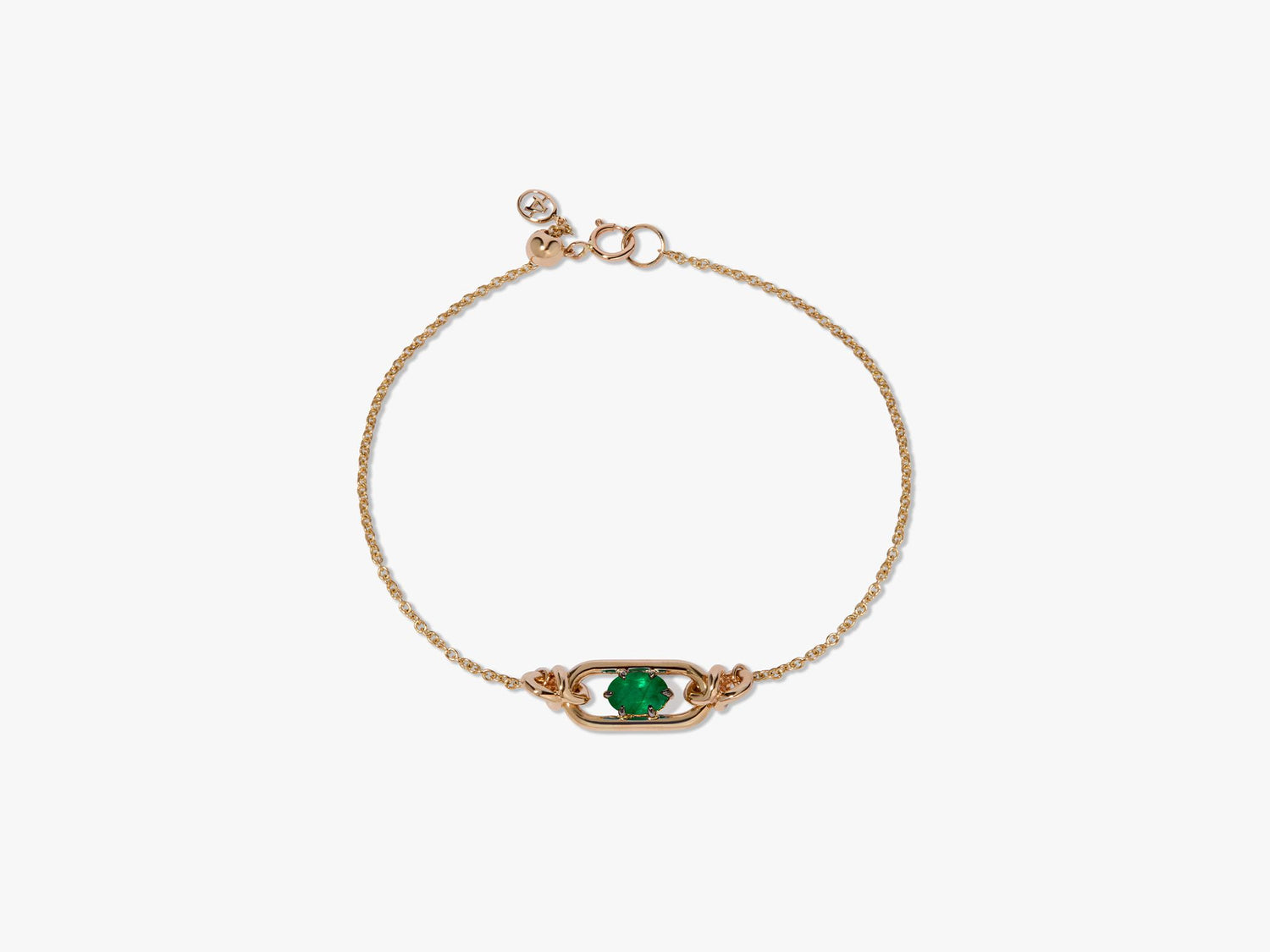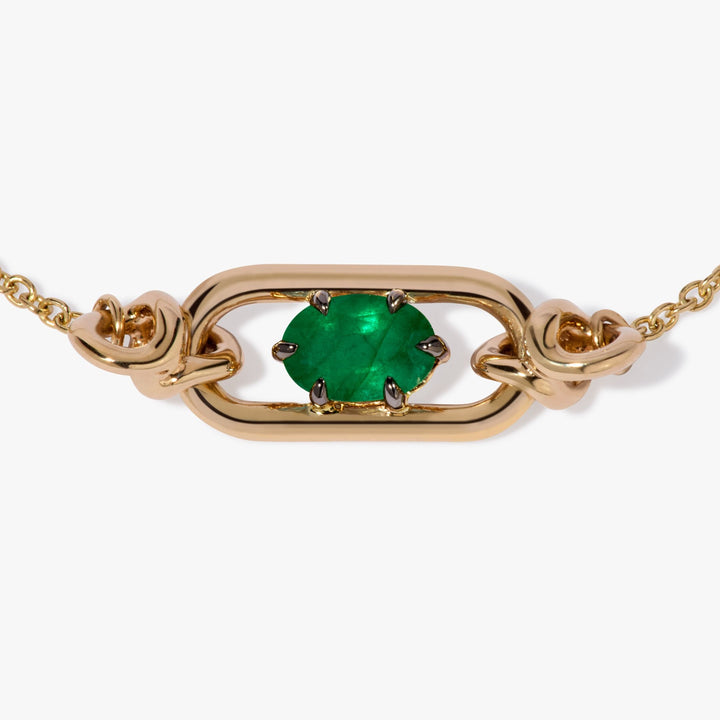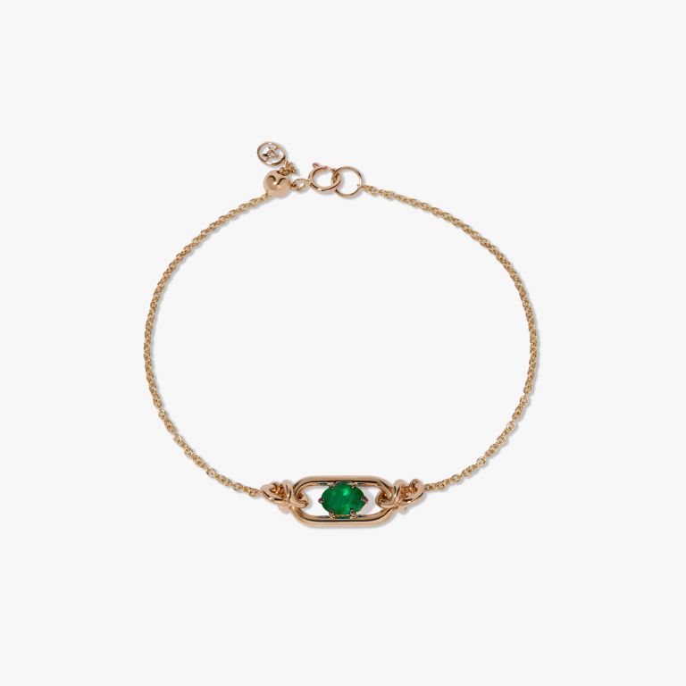 Style Notes: This Gem Set Emerald May Bracelet by Annoushka celebrates birthstones and symbolism through refined craftsmanship. A glowing emerald—May’s birthstone and a symbol of rebirth—sits elegantly within the signature Knuckle link, framed by movable joints and a fine gold chain. The adjustable fit ensures comfort and personal expression, while its streamlined design makes it ideal for stacking or gifting.