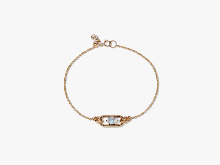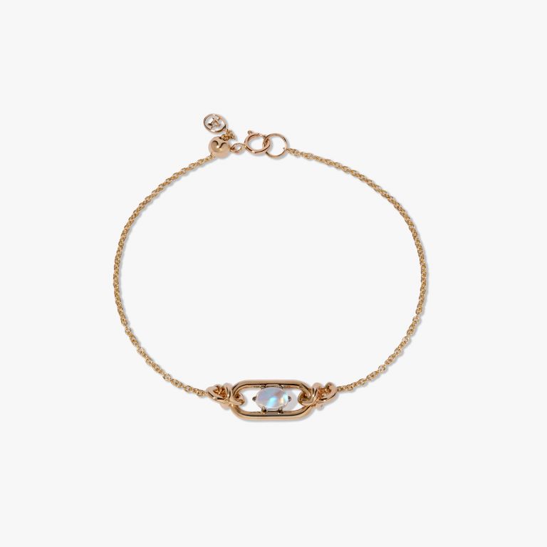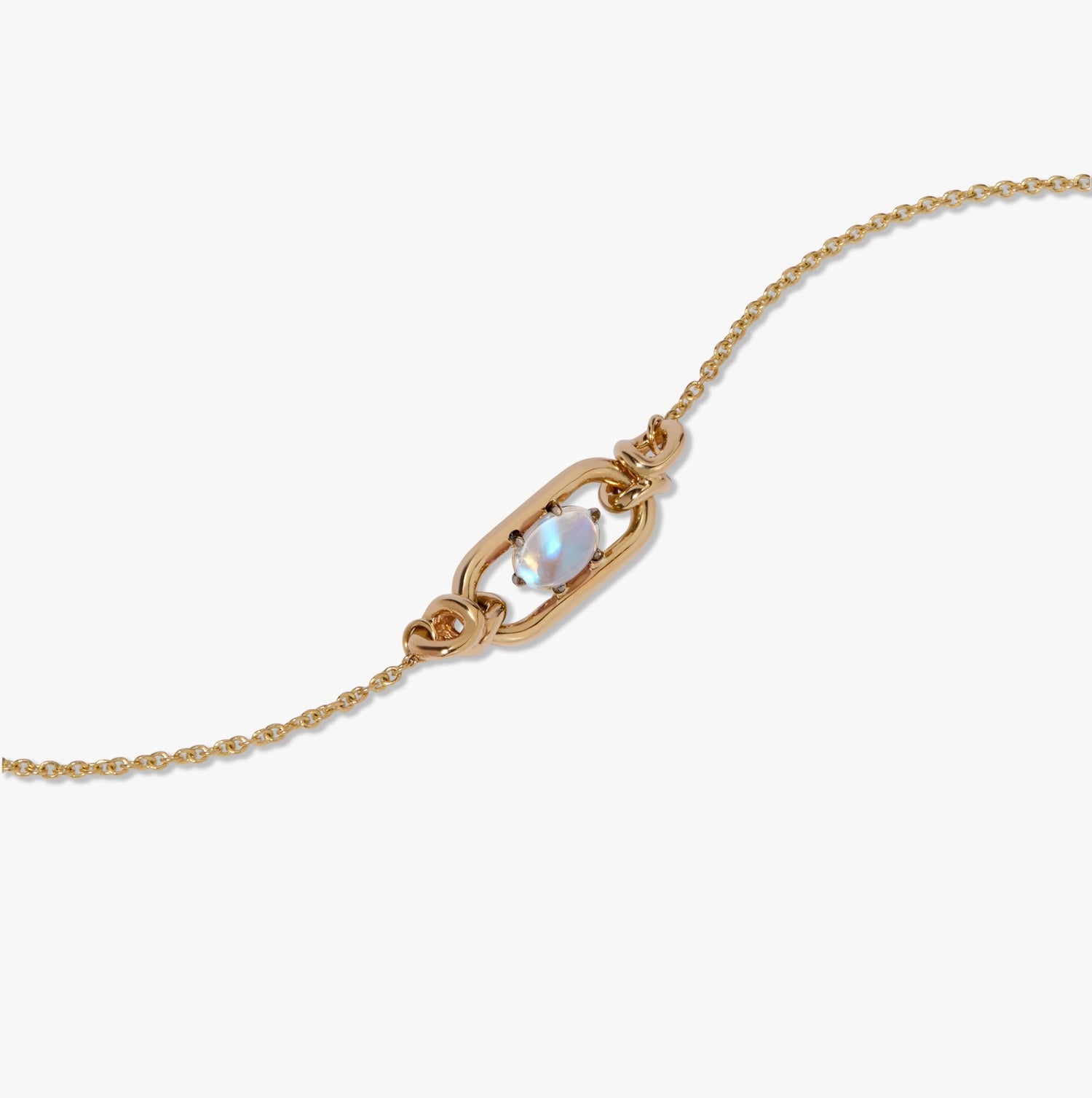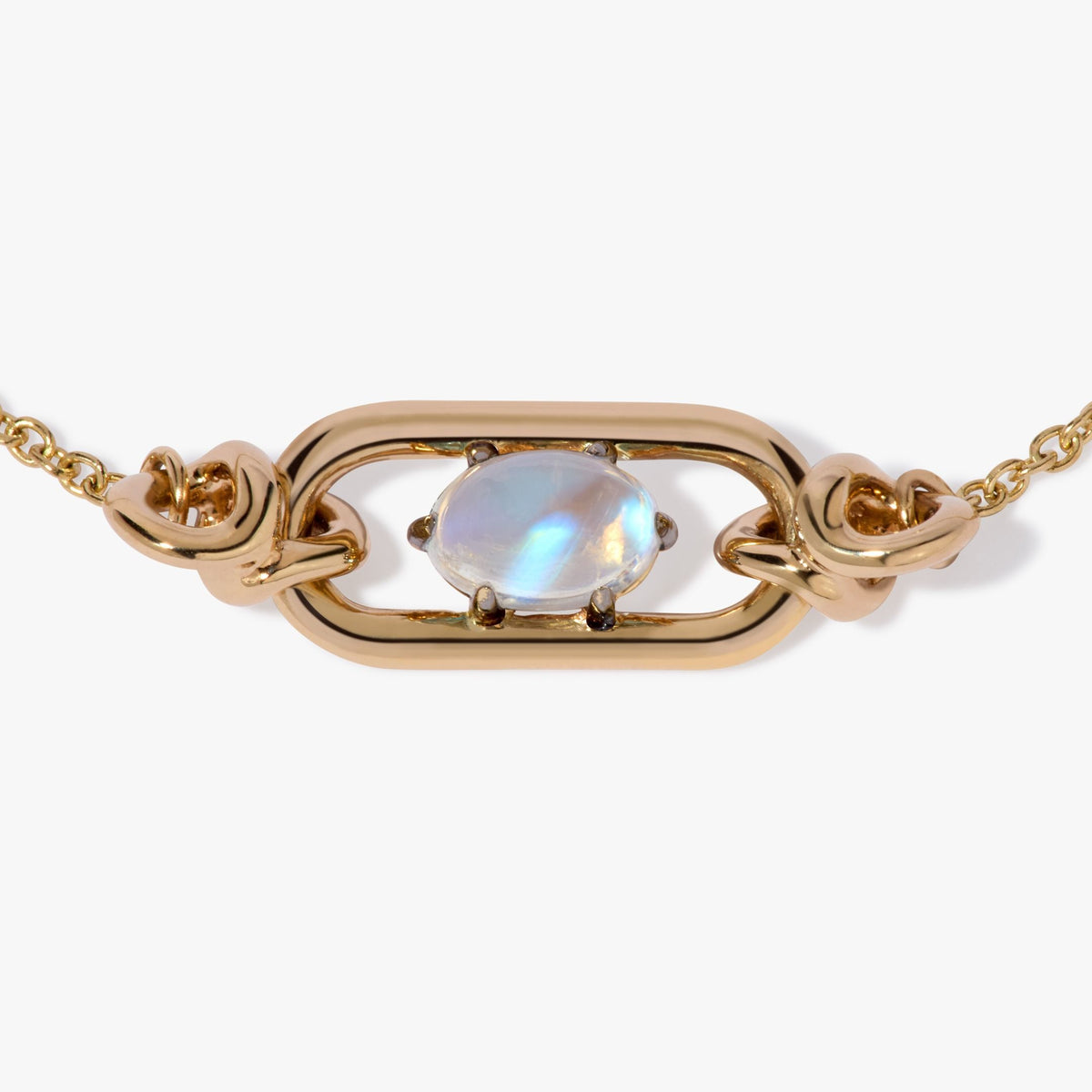 This Gem Set Moonstone June Bracelet by Annoushka honors love and passion with its luminous centerpiece. Handcrafted in solid 14k yellow gold, the bracelet features a glowing moonstone set within the signature Knuckle link, accented by flexible joints for comfort. Adjustable sizing ensures the perfect fit, making it ideal alone or paired with other Knuckle birthstone pieces.