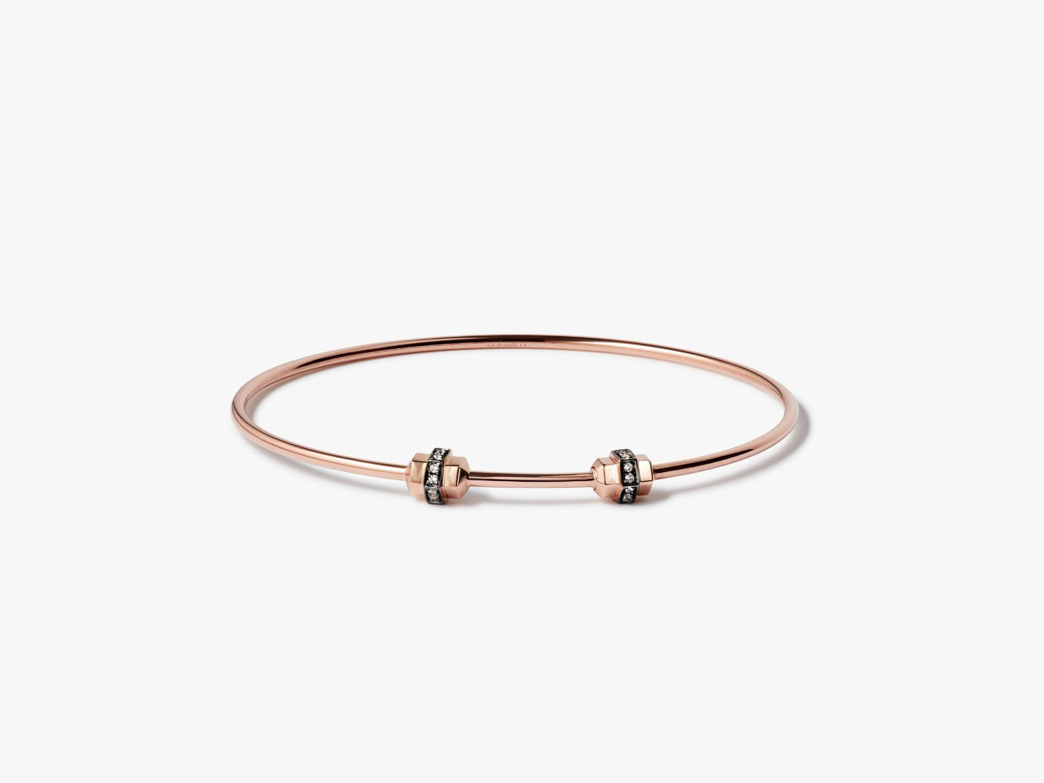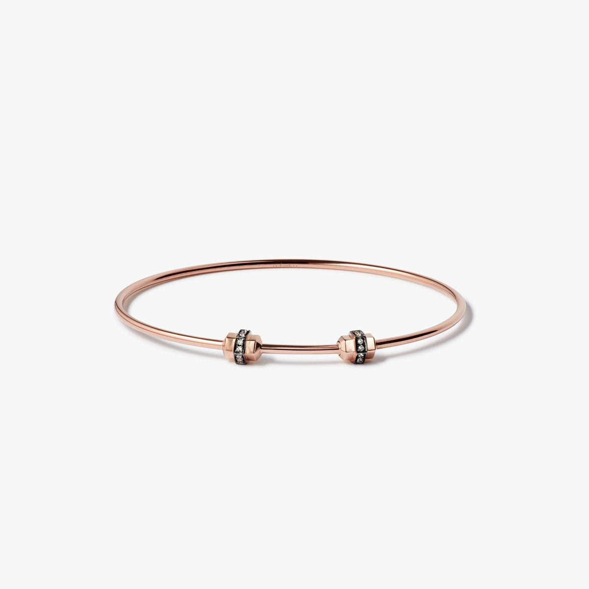 This Sapphire Small/Medium Charm Bangle by Annoushka offers the same contemporary charm in a more compact size. Made in 18k rose gold and set with 0.12ct white sapphires, it measures 47mm x 57mm. Designed with a screw nut clasp for easy removal and styling, it complements charm collections beautifully. Also available in Medium/Large size.