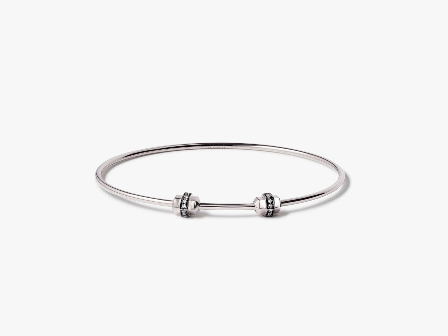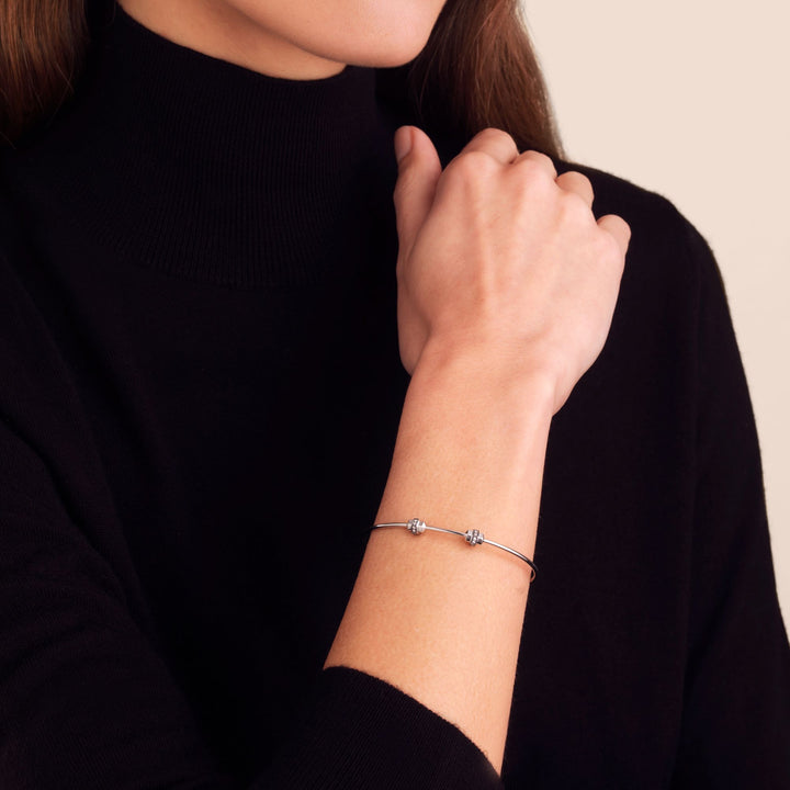 This Sapphire Medium/Large Charm Bangle by Annoushka offers a sleek design in 18k white gold. Adorned with a screw nut clasp and 0.12ct white sapphires, it measures 51mm x 61mm and is designed for versatile styling with charms like Cherub and Initial pendants. Also available in Small/Medium size.