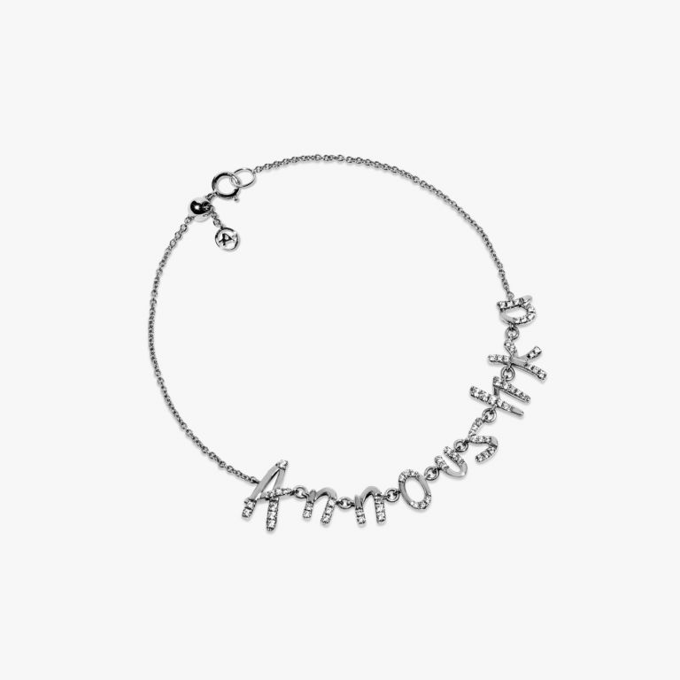 This Chain Letters Personalised Bracelet by Annoushka is a timeless customizable piece in solid 18k white gold and diamonds. Designed with an adjustable sizing slider, it can be personalized with names or phrases, worn solo or layered with other bangles and bracelets for a meaningful, stylish look.