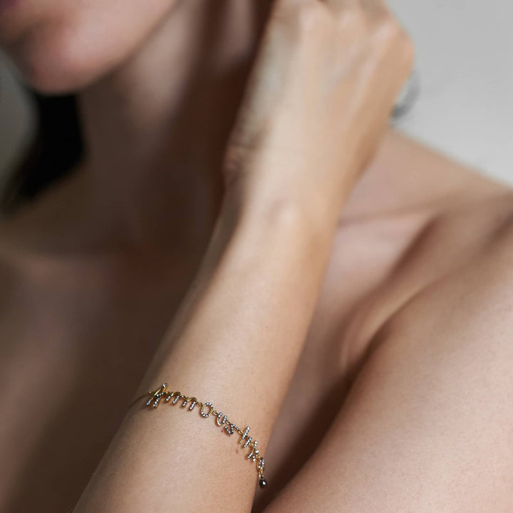 This Chain Letters Personalised Bracelet by Annoushka is a bespoke treasure in solid 18k yellow gold and diamonds. Customizable with any name or phrase, it features an adjustable sizing slider and can be styled solo or layered, reflecting personal style and sentiment beautifully.