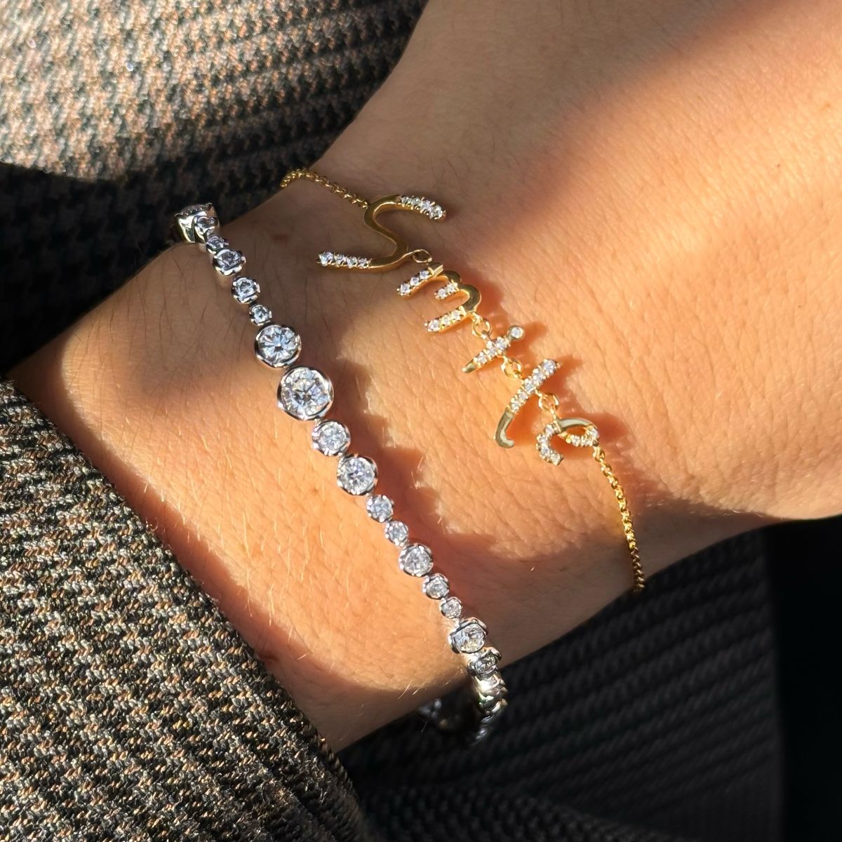 Handcrafted in solid 18k yellow gold with diamonds. Adjustable sizing slider. Personalized bracelet design.