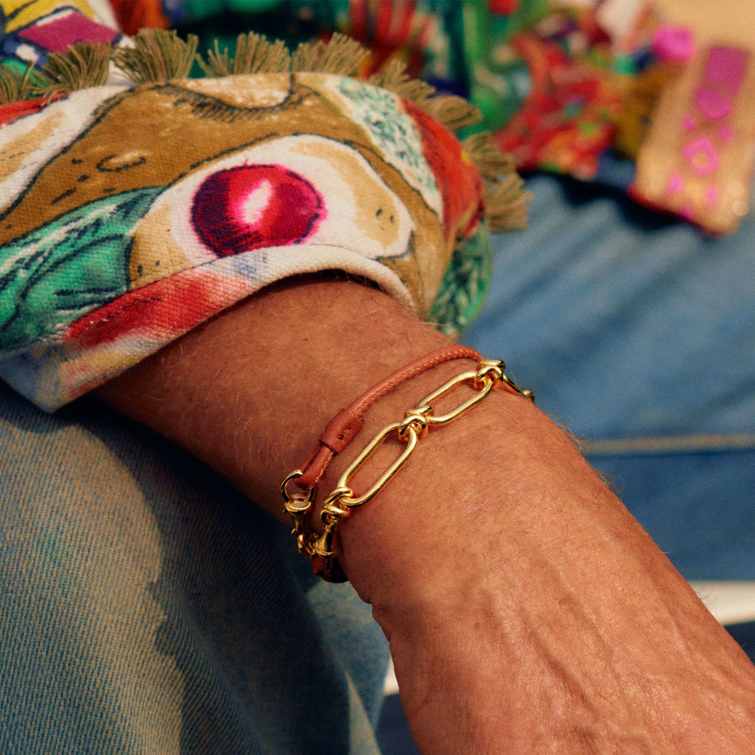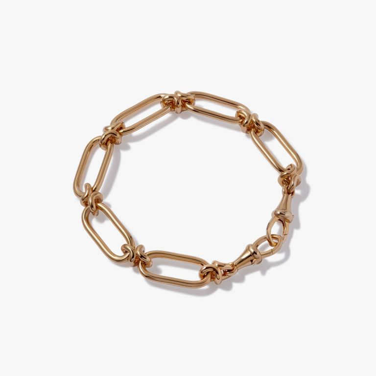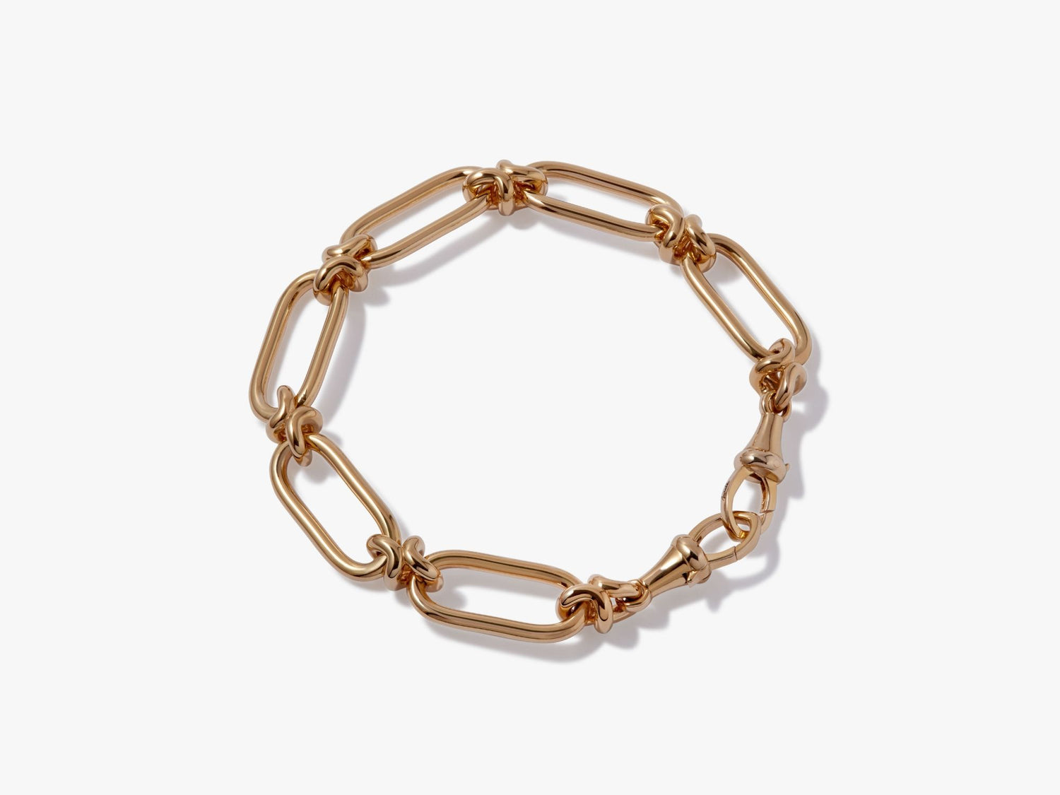 This Knuckle Heavy Chain 22cm Bracelet by Annoushka redefines luxury through innovative engineering and timeless design. Handcrafted in 14k yellow gold, each link is joined by clever knuckle joints that allow fluid movement and styling versatility. Its sculptural horseshoe clasp secures the bracelet while also enabling the piece to interlock with other chains, offering boundless mix-and-match options. Made in Arezzo, Italy, by master goldsmiths, this bracelet reflects Annoushka’s commitment to playful, artisanal elegance.