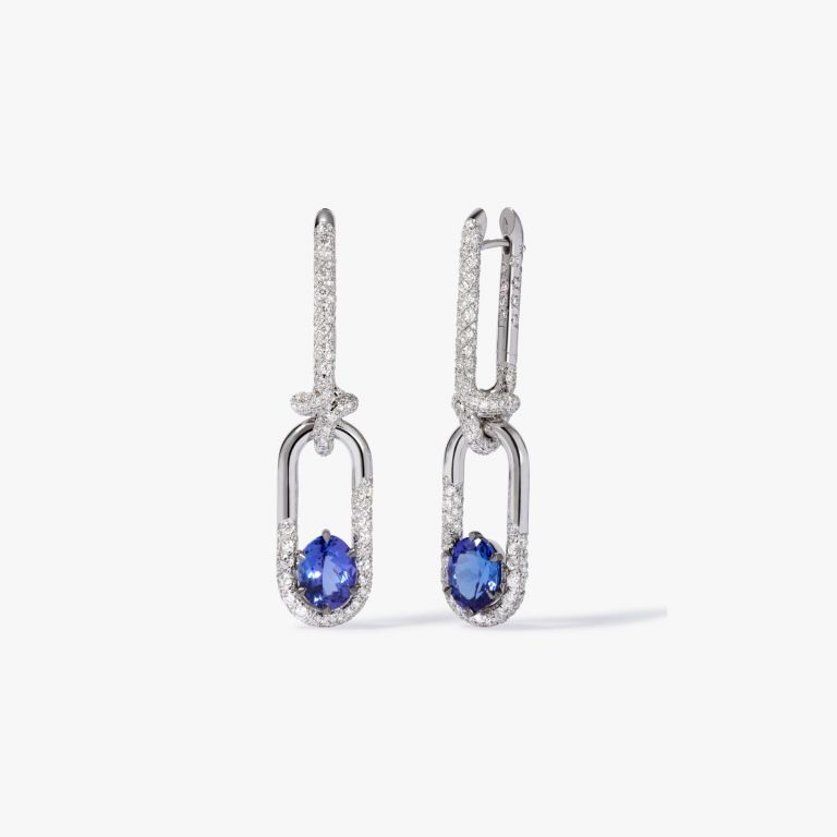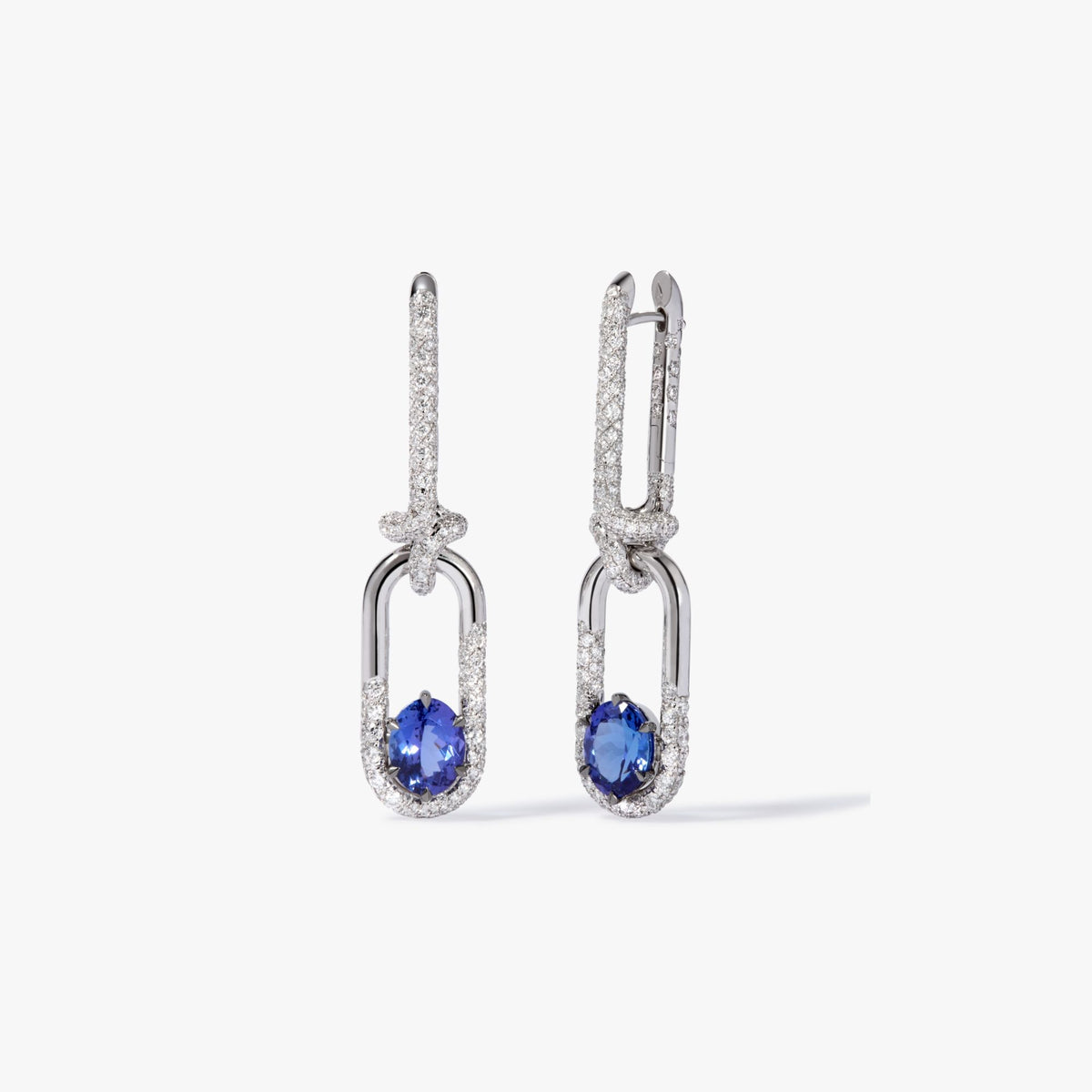 Handcrafted in 18k white gold with diamonds and oval tanzanites. Dimensions not specified.