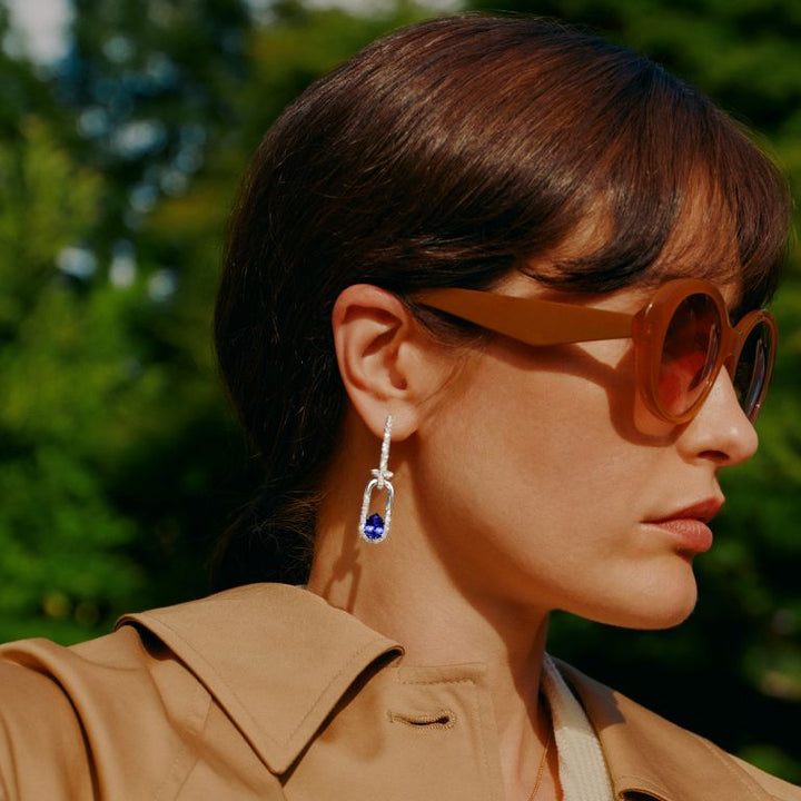 These Knuckle Dust Tanzanite & Diamond Earrings by Annoushka are an expression of vibrant sophistication and spiritual depth. The double hoop silhouette sparkles with diamonds and is centered around luminous oval tanzanites, long associated with truth, dignity, and inner vision. Perfectly matched with the Tanzanite & Diamond Bangle, they bring a contemporary energy to any ensemble.