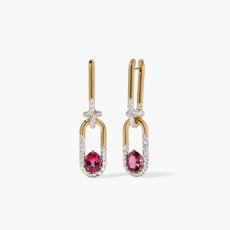 These Knuckle Dust Tourmaline & Diamond Earrings by Annoushka channel vivid emotion and graceful design. The double hoop structure shimmers with diamonds and pink tourmalines—gemstones symbolising compassion, love, and emotional balance. Best styled with the matching Knuckle One of a Kind Ring for a fully expressive ensemble.