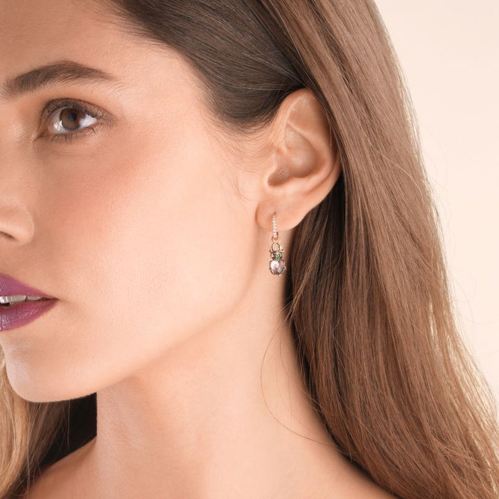 This Beetle Earring Drop by Annoushka, in amethyst, brings mystical charm to your earring stack. Its rose gold body is set with lush purple amethyst, vivid tsavorites, and striking black diamond eyes. Style it solo on a Dusty Diamond Hoop or mix with the other beetle drops for a playful trio.