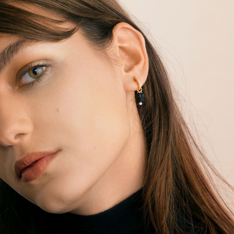Handcrafted in 18k yellow gold with ebony and tiny moving pearls. Detachable design.
