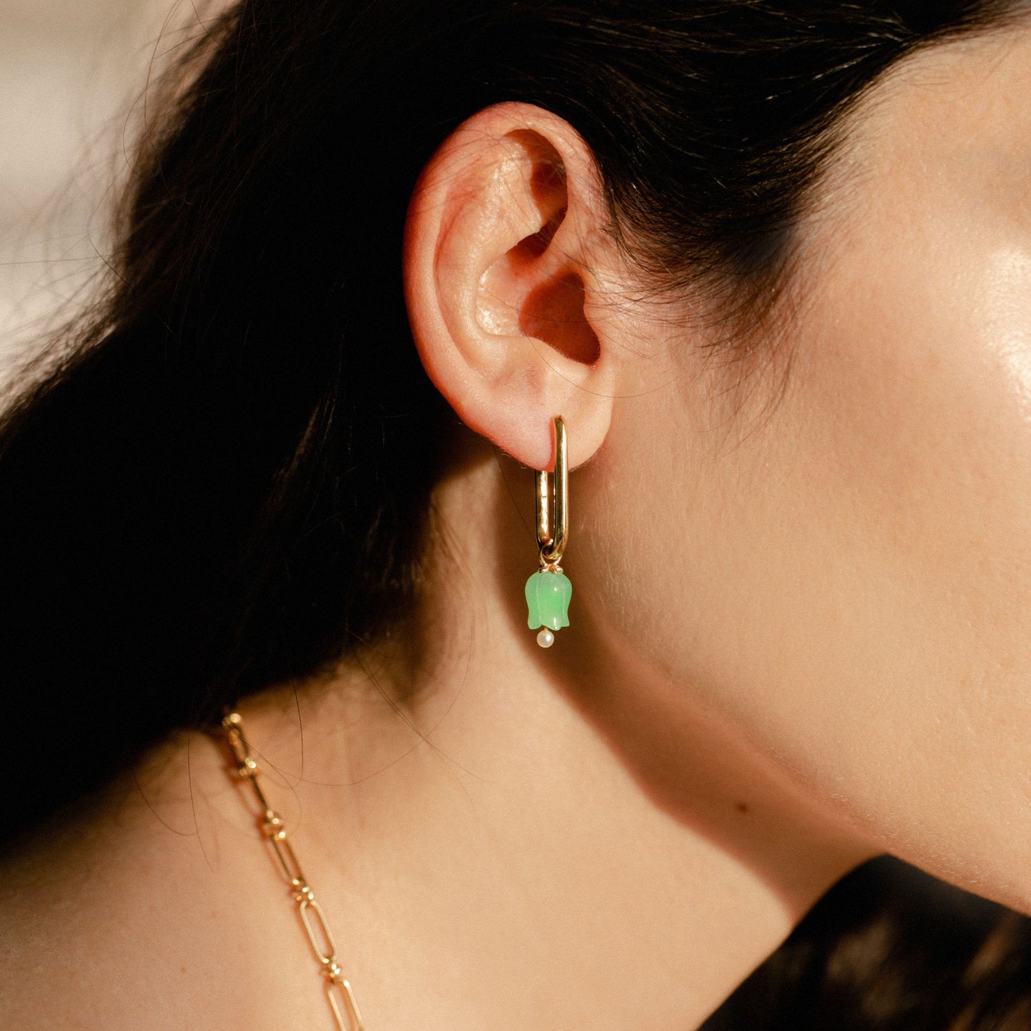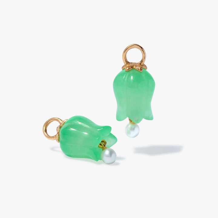 Tulips handcrafted in 18k yellow gold with jade and freshwater pearls. Hoops crafted in 14k yellow gold. Detachable drops.